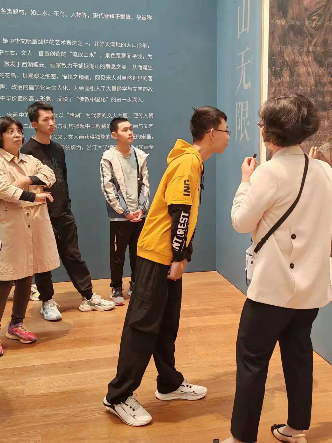 恋恋不舍的走出造物之美展区,师生们来到了“百代标程—悦读宋韵”展区,畅游于古代书画的汪洋之中,正可谓艺术是时代的发言人,从北宋到南宋,画作中的景物,画作风格的转变,无一不体现着艺术时代性和地域性的变迁,欣赏着千年前的古迹,感受着不同大家的笔法和画中蕴藏的深意,我们都沉浸醉在书画之间。而更令人惊叹的当属王希孟的《千里江山图》,长铺在整个展厅里的画卷,诉说着历史的厚重,我们既惊叹于那个十八岁的天才少年的神奇画笔,也感慨着古代才子的妙手丹青和创造力。一位同学也迫不及待地说出自己的感受:“《千里江山图》令我最印象深刻,尽管是放大版,但是它的长度仍然让人叹为观止,细腻的线条与纹理,展现了祖国的大好山河,尤其当梁老师提出的小问题:作者在未遍历山河却为何创作出如此恢弘、形象的画面时,更让我体会到作者的想象力与创造力之丰富多彩。”
