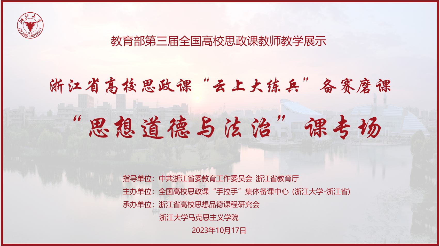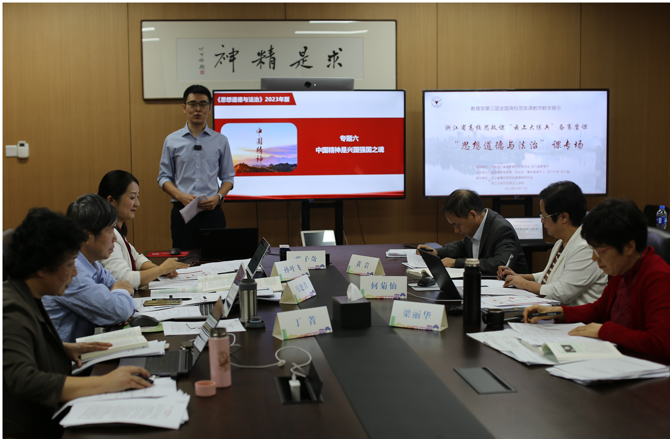 2023年10月17日上午,由全国高校思政课“手拉手”集体备课中心(浙江大学-浙江省)主办的浙江省高校思政课“云上大练兵”备赛磨课首场活动“思想道德与法治”课专场在浙江大学马克思主义学院进行,面向全国同步线上直播。活动得到了浙江省教育厅的指导和支持。首场磨课活动由浙江大学马克思主义学院和浙江省高校思想品德课程研究会共同承办。
