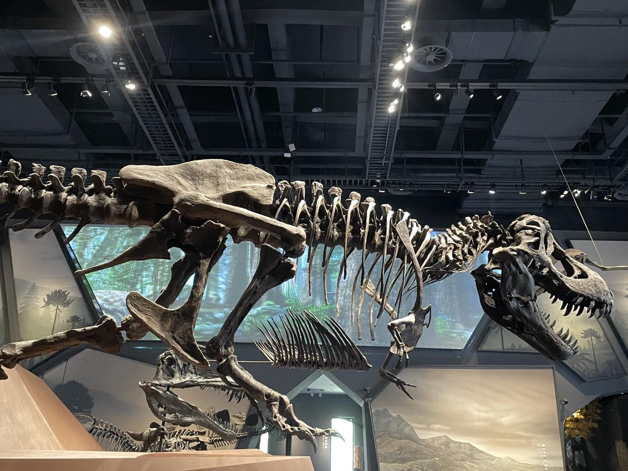 在进入恐龙馆后,恐龙巨大的骨架模型映入眼帘。这些古老的生物以一种全新的方式在同学们面前“复活”,仿佛在无声地讲述着恐龙时代的传奇故事。同学们依次使用模拟望远镜观赏恐龙时期的生活动画,逼真的叫声和生动的画面让人们仿佛置身于白垩纪的原始森林之中。
