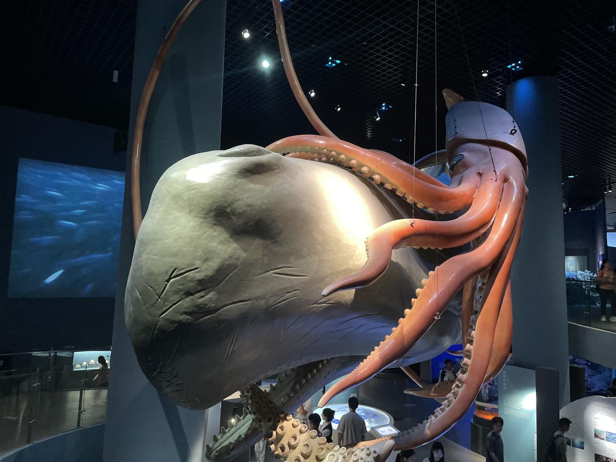 步入海洋馆,一片深蓝的海洋世界在眼前展开。在这片海洋世界里,各种海洋生物让人目不暇接。小水母、抹香鲸、大章鱼、珊瑚丛等,它们在海水中悠然自得,展示着海平面下丰富多彩的生态世界。然而,在这片美丽的海洋生态中,也隐藏着许多让人痛心的场景:被割掉鱼翅的鲨鱼、误食垃圾而死的海鸟、白化的珊瑚等等。触目惊心的场景让同学们深感保护海洋生物的重要性。