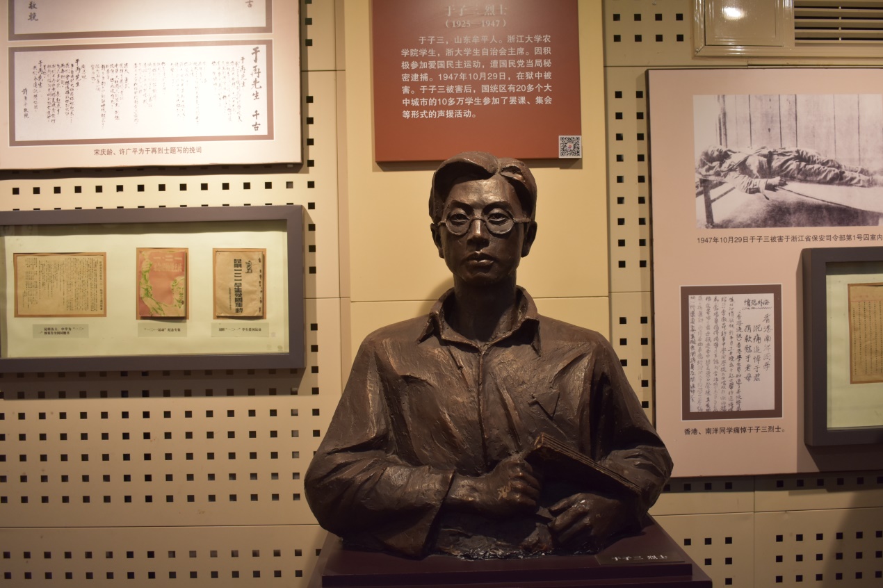 在多媒体展板前,胡老师进行现场讲解。她指出,同学们在关注政治经济外交史等宏大叙事的同时也要去了解一些普通人物的微观历史,关注每一个具体人物的心路历程与关键抉择,因为正是这些事迹,才构成了鲜活的历史,才能让我们更好地认识过去,面对当下和展望未来。她向同学们讲解了为什么浙江是中国共产党的诞生地之一,1945年浙江学生为什么声援昆明“一二一”运动,“于子三”事件为什么最终发展成为全国性反将浪潮等问题,使同学们对过往峥嵘岁月有了更深的理解和感悟。