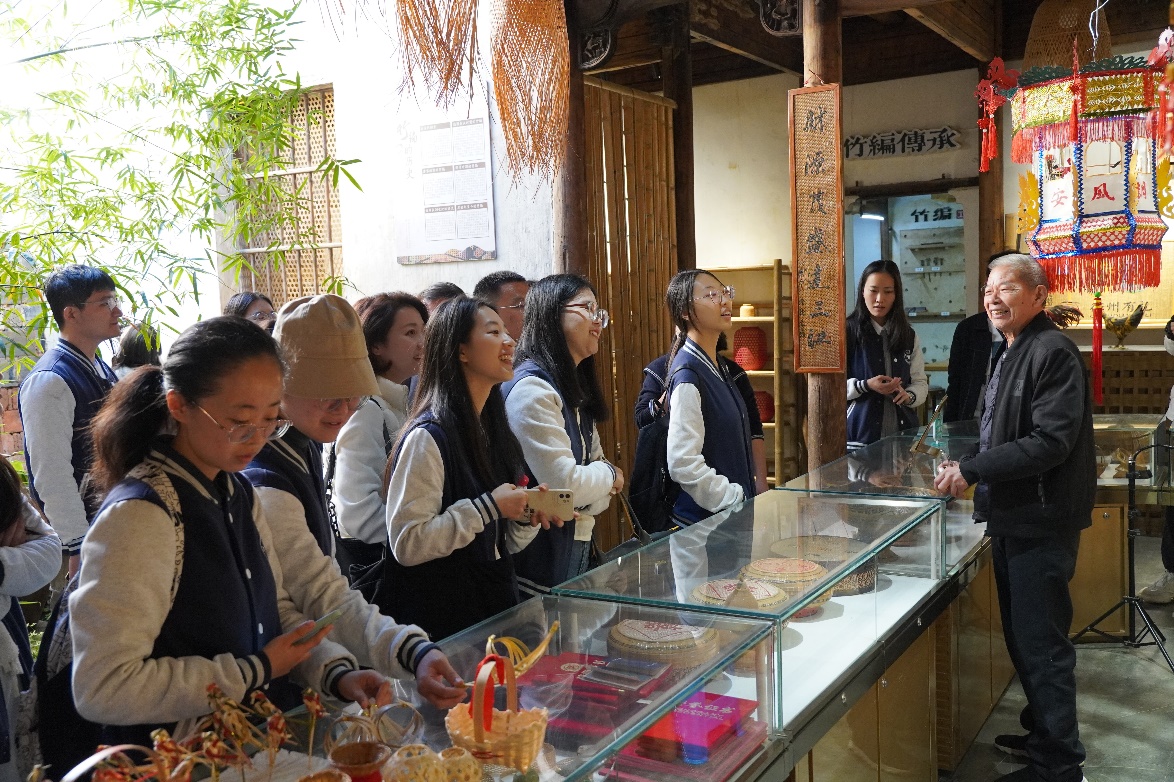 游览中国乡村美术馆之后,实践团队成员参观了余东画村的部分展厅,详细了解文创产品的展出情况。在南孔文创展厅,印有农民画的丝巾、雨伞、提包、陶瓷杯均有独一无二的版权。在时光邮局,油桶、老式电视机、老式打字机、收音机、报纸、地图、毕业证书等60-70年代的展品引人追忆改革开放前的农民生活场景。头雁直播间的双柚汁、手工面、地瓜粉等展品特色产品展销至多个国家和地区,助力扩大余东农民画品牌的影响力。在清廉乡村展馆,一幅幅农民画作以生动易懂的形式,表达对廉洁从政、勤俭节约、拒腐防变的追求。在竹编馆,实践团队成员与坚持从事竹编工艺60余年的余统善老先生进行对话,了解展厅内的竹篮、动物、灯笼、名人像等竹编作品的创作历程,以感知传统造物的方式感悟匠人的“绣花针”精神。