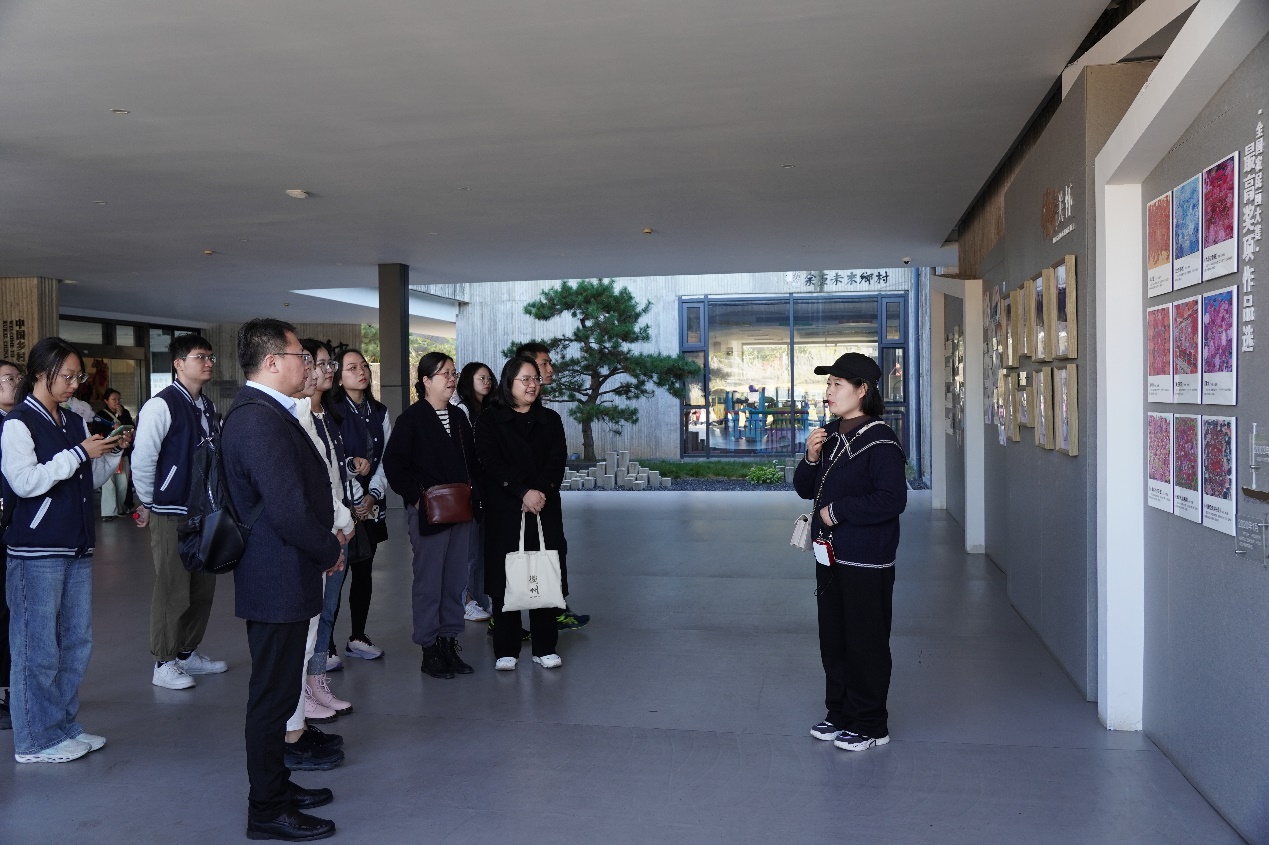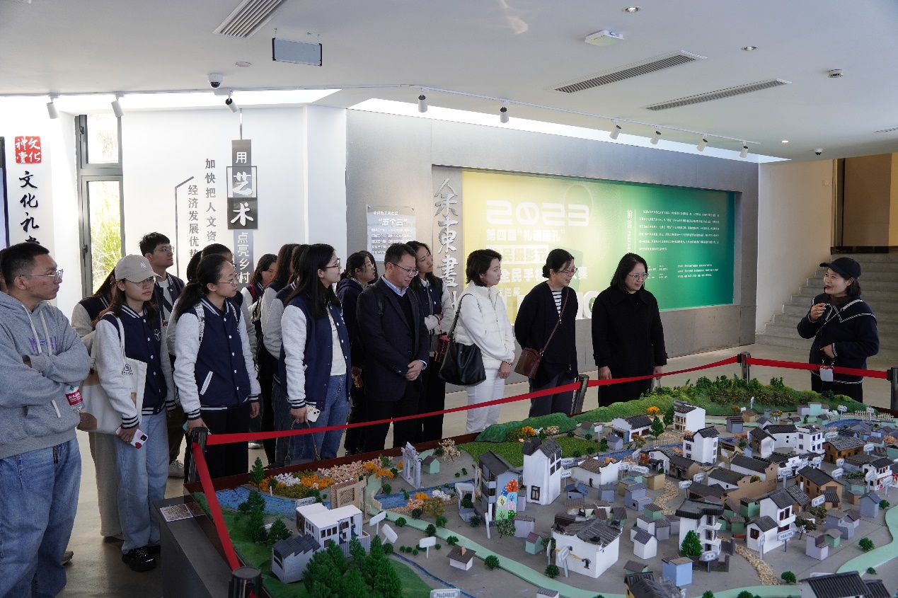 实践团队成员来到余东村中国乡村美术馆,了解余东画村的发展历程。余东画村隶属“全国民间文化艺术之乡”——沟溪乡,被称为“乡野毕加索画乡”,以农民画为其最靓丽的“金名片”。余东村从20世纪70年代起走上农民画创作之路。历代农民发扬“三牛”精神,“白天拿锄头种地,晚上拿笔头画画”,把卧室当画室、门板当画板,孜孜不倦地描绘自己的精神追求,代代传承农民画创作技艺。目前,余东村已由最初参加培训的6位农民发展为48名骨干成员,800多人的村庄有300多人参与农民画创作。《大吉图》等色彩艳丽、纹饰优美的农民画彰显“种文化”底蕴,流露出对中国共产党的感激之情和实现共同富裕的决心,屡屡在全国农民画展上获奖。在2003年余东农民画协会成立后,余东农民画从自娱自乐逐步成为文化品牌,以农民画为基础开发的系列特色文创产品走向市场,组织的农民画展被人民日报、央视新闻等央媒竞相报道。2020年9月起,余东村以农民画为特色启动未来乡村建设,推进卖画向卖文创、卖版权、卖风景、卖旅游的转变,相关农民画产业年度产值超过2000万元。余东村以文化产业带来的共富成效表明,“文化也是增长点,也是生产力,是可以带动群众致富的”。