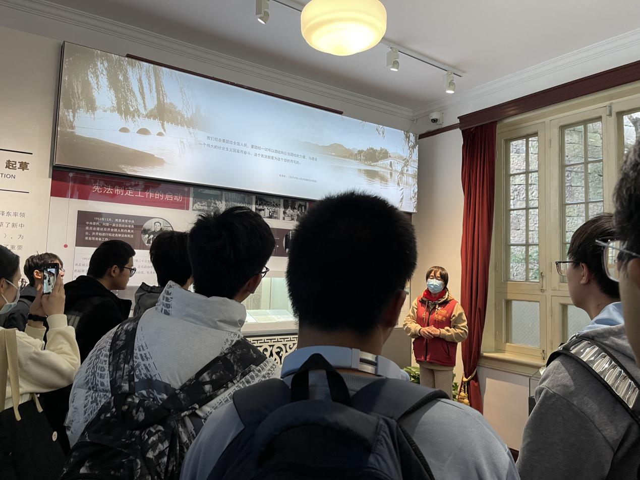 本次活动重点进行了对宪法起草环境的参观,对“五四宪法”从起草到实施全过程的讲解及对宪法宣誓墙与毛主席雕像的瞻仰。在复原陈列展区,老师和来自“五四宪法”历史资料陈列馆的志愿者讲解员带大家参观了毛主席和宪法起草小组过去的办公环境、生活环境,还原了他们夜以继日、呕心沥血地对宪法初稿进行讨论、修改的场景。在主题陈列展区,讲解员以制定“五四宪法”的历史背景为切入口,娓娓道来毛主席率领宪法起草小组如何废寝忘食写出“西湖稿”,全国各界人士参与宪法草案大讨论、修改及补充的盛况,最后讲述“人民的宪法”获得全票通过的历史。同时,强调“五四宪法”精神的传承与弘扬,以及展示全面实施宪法的情况。在陈列馆外的小广场上和陈列馆内的序厅中,同学们庄严瞻仰了宪法宣誓墙、毛主席雕像及雕像后墙上镌刻着的毛主席当年说过的话——治国须有一部大法。