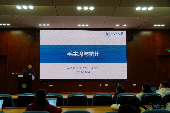 12月16日晚,马克思主义学院“纪念毛泽东诞辰130周年”系列活动专题讲座第一讲在成均苑2幢100报告厅顺利开展。马克思主义学院副教授张立程老师带来“毛主席与杭州”主题讲座,以期增进同学们对于毛泽东同志的了解,学习领袖事迹,坚定理想信念。