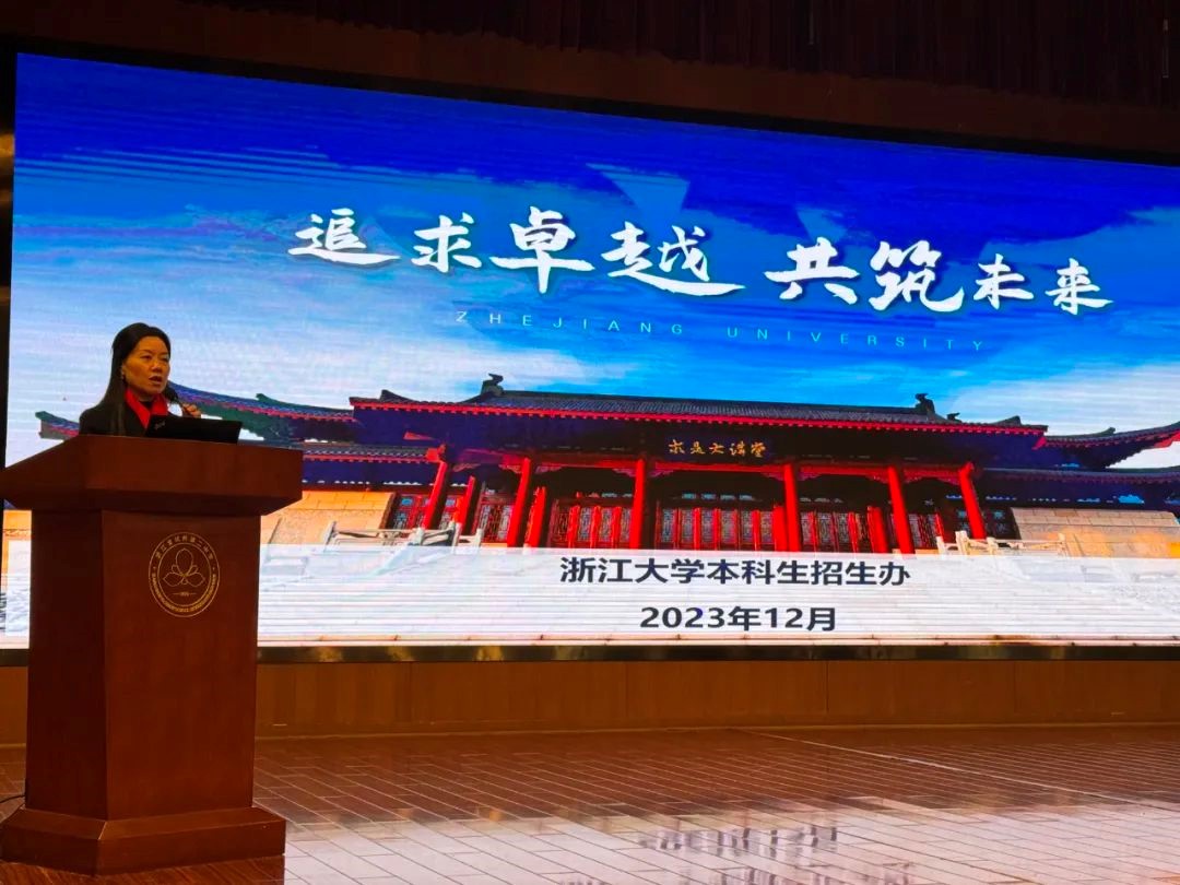 活动初始,杭州二中蔡小雄校长向与会成员表示诚挚的欢迎,他提出杭州二中与浙江大学马克思主义学院共建思政课是大思政教育的重要一环,对促进两校思政课发展具有重要意义。浙江大学本科招生处处长汤海旸老师和招生处副处长留岚兰老师向杭州第二中学同学们全面介绍了浙江大学的综合情况与招生标准,欢迎杭州第二中学同学了解和报考浙江大学。