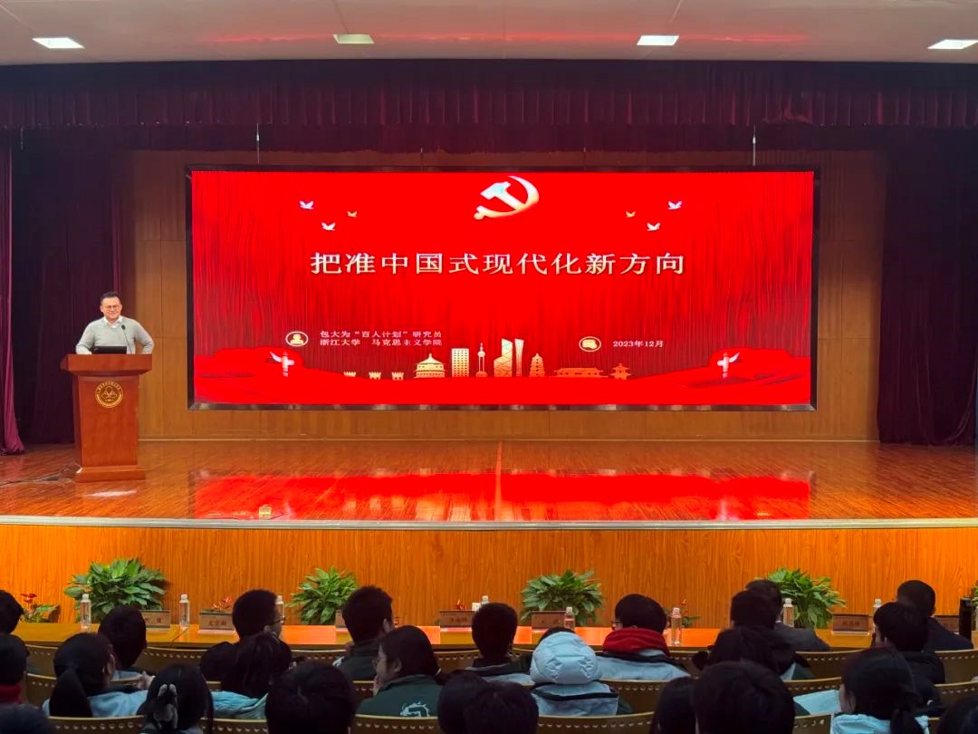 仪式后,浙江大学团委副书记、马克思主义学院教师包大为研究员围绕“把准中国式现代化新方向”这一话题向杭州二中同学作了生动宣讲。包大为老师通过回顾历史发展进程,结合时代发展趋势,深入解读了马克思主义和中国式现代化的深刻内涵,重点指出现代化不是西化而是各国人民自主探索的人与生产力不断解放的有效路径。他表示,在追求现代化的道路上,我们永远不能“借车上路”,而要“造车上路”。包老师鼓励同学们将个人进步与国家民族发展相结合,不断学习,打牢基础,在未来为中国式现代化建设添砖加瓦。宣讲中,包老师旁征博引、引经据典,用新时代、新青年们易理解的角度作切口、谈理论,语言幽默风趣,赢得了同学们的阵阵掌声。宣讲结束后,部分同学与包老师进行了交流。