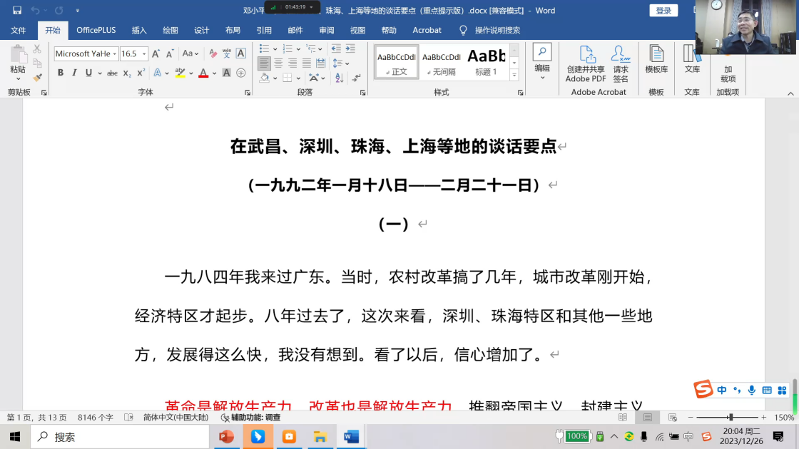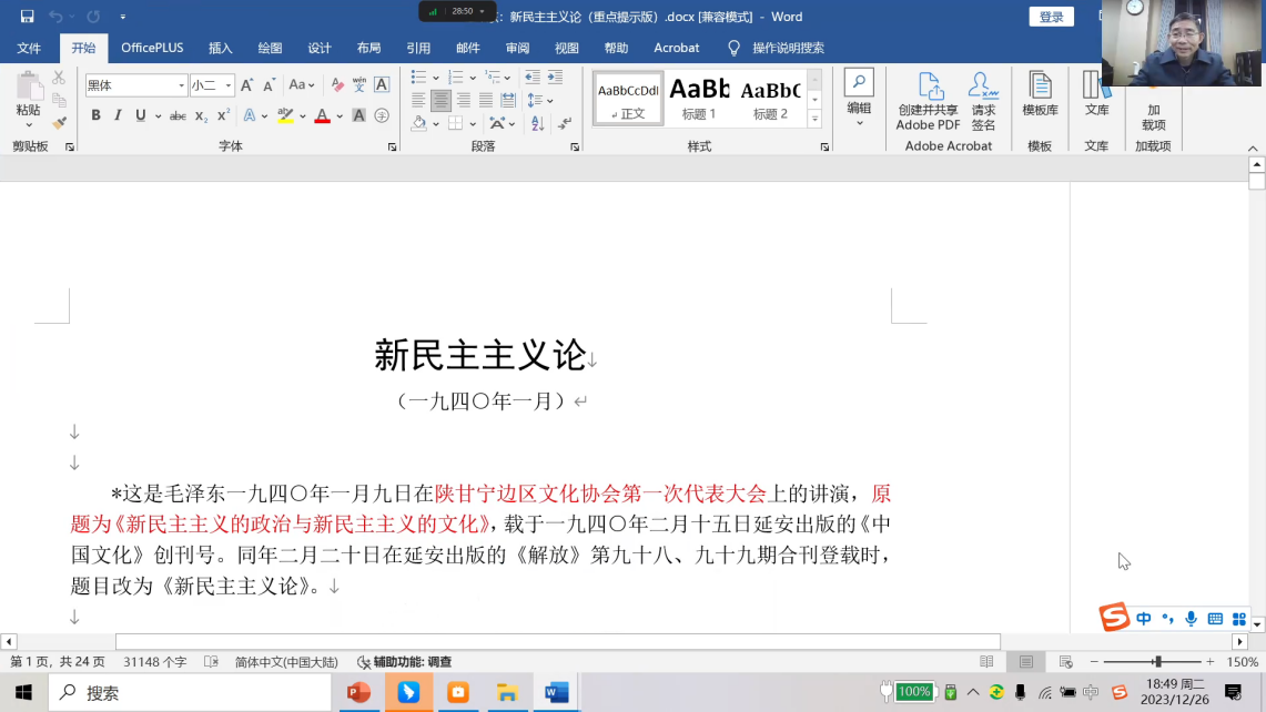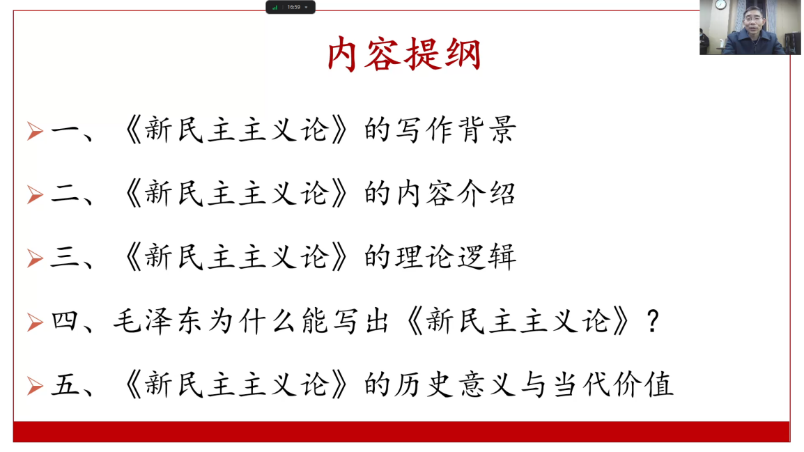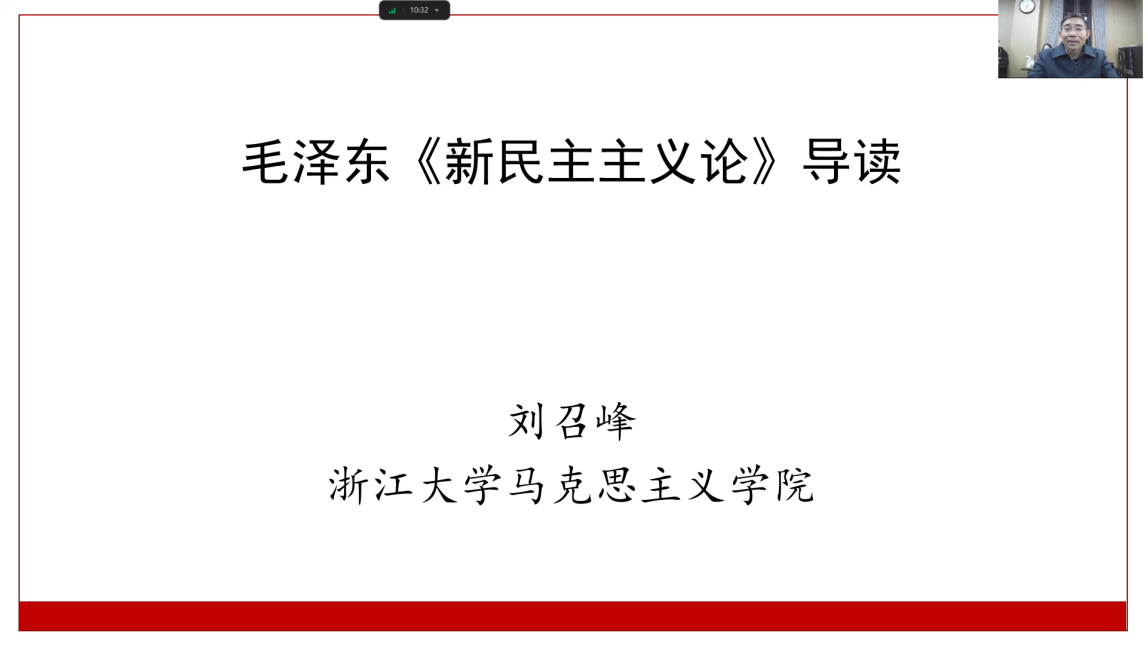 2023年12月26日晚上,浙江大学研究生党员骨干著作研读示范班(2023)第三次集中研读课以“钉钉”线上直播的方式开讲。本次课程由马克思主义学院刘召峰老师领读《新民主主义论》和邓小平“南方谈话”,全校各学院研究生党支部骨干培训班学员线上参与本次课程,部分马院同学线下旁听课程。