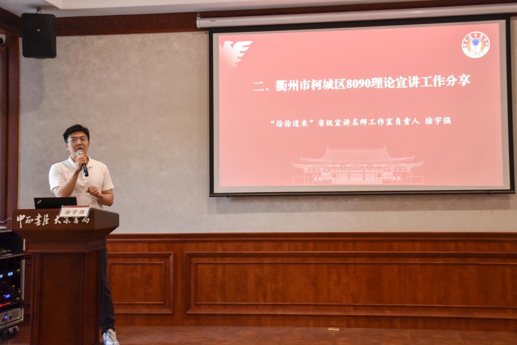 接着,衢州市柯城区“徐徐道来”省级宣讲名师工作室负责人徐宇强作理论宣讲工作经验分享。徐宇强以“三个新”——宣讲团队新、体制保障机制新、阵地建设新为要点,介绍“徐徐道来”省级宣讲名师工作室的理论宣讲工作经验。徐宇强指出,近年来,柯城区“徐徐道来”省级宣讲名师工作室突出“农民宣讲团”“8090宣讲角”等特色,不断创新宣讲形式、拓展宣讲场域,并希望将来以更新颖的形式,推动浙大马院与柯城区8090+新时代理论宣讲团在持续的理论走亲中“越走越亲”。