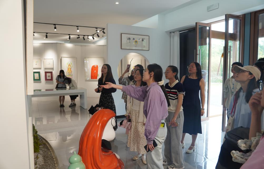 走进蔡志忠文化馆,进门就是“孔子、庄子、老子”的形象大挂画,下面则是以蔡志忠达摩形象复刻的经典橘色雕像。蔡志忠文化馆展陈着蔡志忠老师在日本闭关四年创作的诸子百家原版漫画、山海经系列、儒家思想长卷、水浒108将长卷等众多作品。蔡志忠先生赠予百丈镇的漫画主题作品《独松关》,以独特的视角和创意,传递了对传统文化的热爱和对乡村振兴的期待,表达了自己对于漫画艺术与乡村文化融合发展的思考。蔡志忠文化馆主理人宋继中先生向支部的同志们现场讲解了展画的工艺制作过程,让大家在一道道工序中领略了现代工艺之精和传统文化之美。