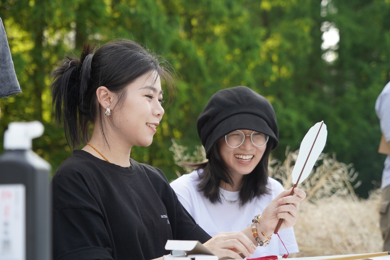 参观结束后,浙大马院与中国美术学院的同学们在梦园教学区艺术项目“一年级的自留地”区域开展艺术体验活动。在美院专业基础教学部同学的指导下,同学们纷纷拿起毛笔,在扇面和书签上挥毫泼墨,用丹青妙笔架起两校友好交流、合作互助的桥梁,抒发新时代青年对未来的美好愿景、对党和国家的无限深情。美院同学还在现场亲手制作了书画扇子与书画书签赠与参加活动的同学们,两校青年的友谊在交流中进一步加深。