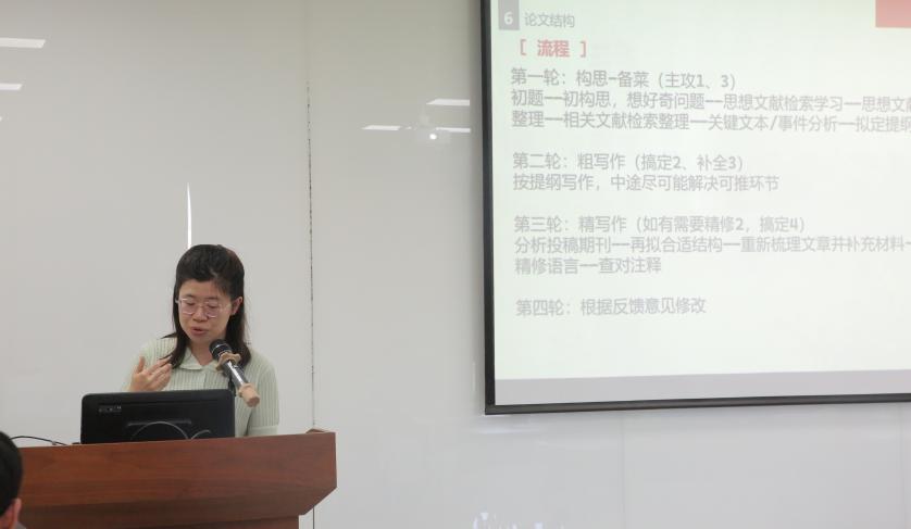 陈晴同学以《从构思到修订:一篇论文的写作流程演示》为题进行分享。她以“毛泽东的斗争精神”这一主题为例,展示了自己写作学术论文的完整流程。陈晴指出,一篇论文由“观点与思想”“选题与结构”“模块内部材料与论证”及“语言”四部分组成。整体而言,论文写作的大致步骤包括构思与准备(主攻思想与材料)、粗写作(搞定结构与补全材料)、精写作(精修结构与修饰语言)及根据反馈意见进行修改。具体来看,构思与准备阶段包括确定主题、初步构思、检索文献、分析文本、拟定提纲等环节;粗写作阶段重在快速写作与逐步修改,应避免完美主义心态,并合理分配时间;精写作阶段要注重优化文章结构、打磨语言文字、树立读者意识,使文章在不断修改中臻于完善。最后,陈晴鼓励与会同学们积极寻找学术兴趣点,关注相关领域的发展动态,保持对研究的热情和动力,在具体领域持续深耕。