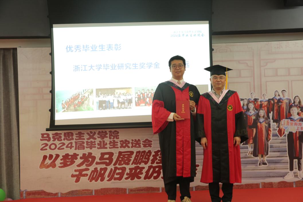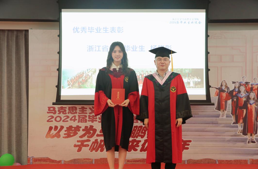 党委副书记徐晓霞老师宣读了2024届优秀毕业生名单。浙江省优秀毕业生杨晓彤,浙江大学优秀毕业生杨晓彤、丁中正、李学敏、王珊、夏鑫雨、陈珂、魏颖、蔡亦恬、董智慧、苏悦以及浙江大学优秀毕业生奖学金获得者杨思远等同学上台接受表彰。李小东书记为获表彰毕业生颁发证书。