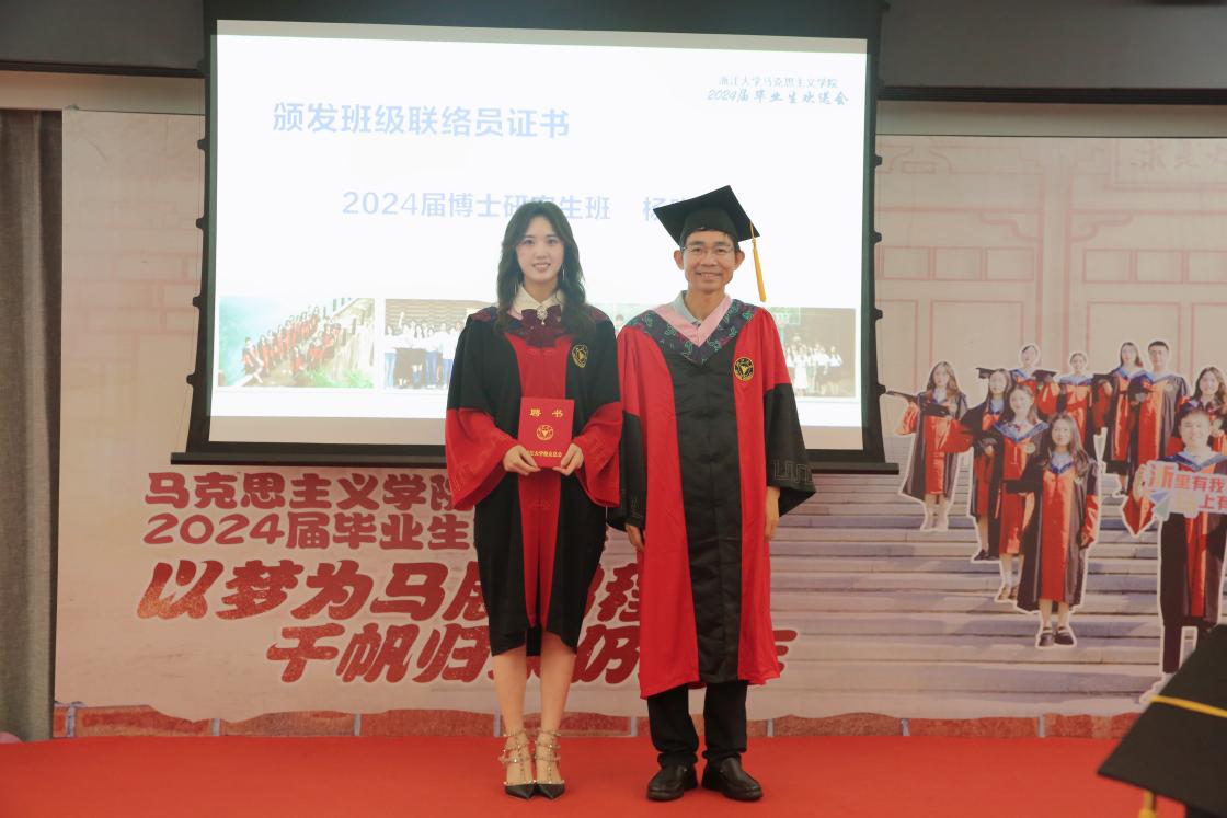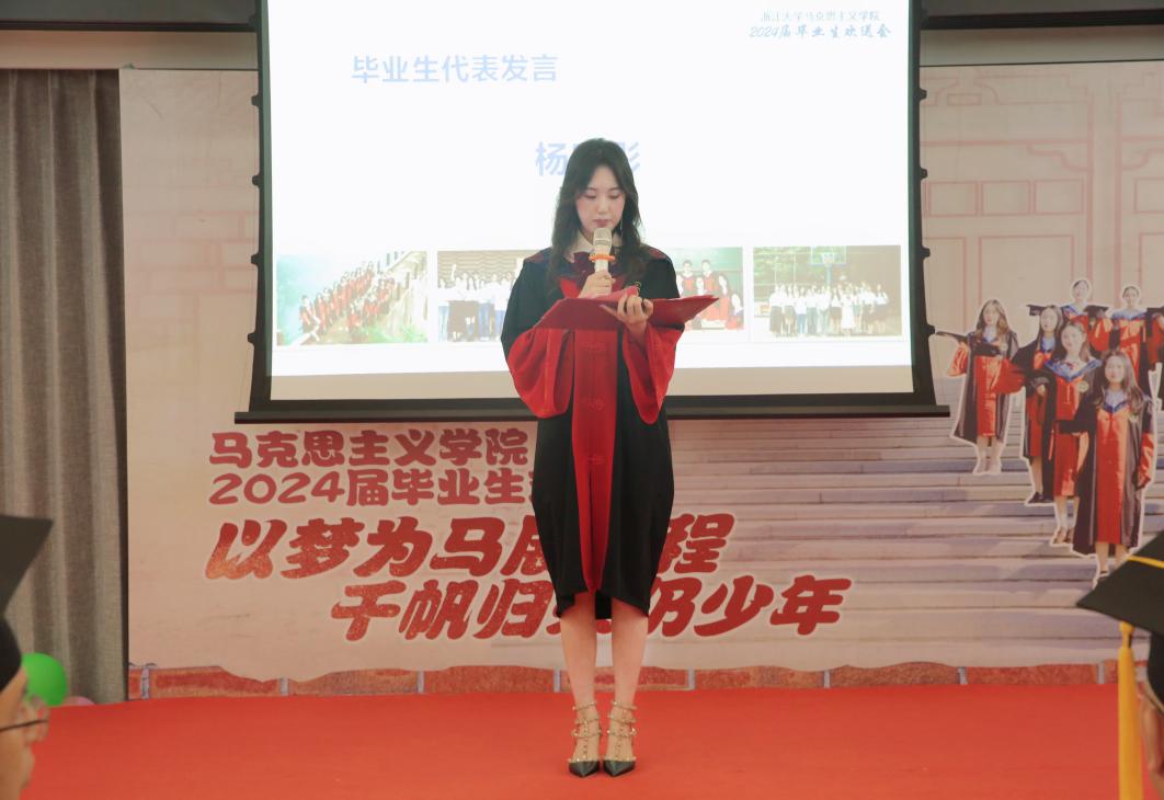 毕业生代表杨晓彤博士代表2024届全体毕业生发言,从“浙里”启程,马院姓马、在马言马的坚定信仰,以及专属于马克思主义学习者和践行者的红色基因,将继续播撒在国家现代化建设和民族复兴的伟大征程上。毕业生仍然会以从容心态和笃定信心,坚定传承浙大马院人的优秀品质,在逆境中坚持,在困难中崛起,在黑暗中传递温暖和光亮。