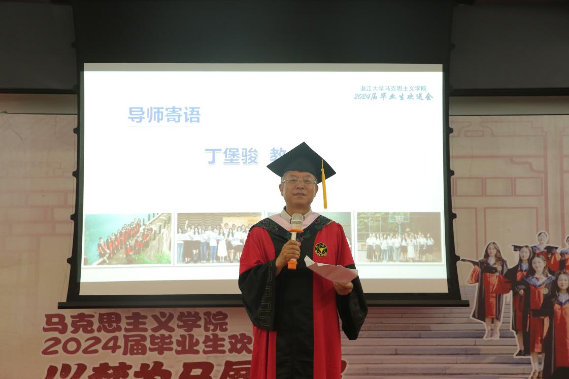导师代表丁堡骏教授寄语毕业生,祝愿同学们离开马院,在人生大舞台上书写出无愧于时代的伟大成就,继续弘扬浙大马院优良传统,政治上严格要求自己,不断改造自己的世界观,未来不论走得再远,也要记得回“家”看看!