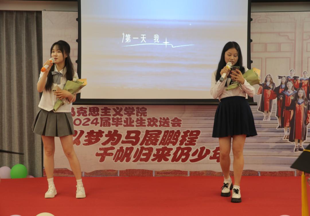 2023级硕士生桂昊月、陈小燕带来歌曲串烧《在凤凰花开的路口看第一天的青空》,为学长学姐送去最美好的祝福,愿再见面时,于人生更高处,笑谈时光漫漫,风雨灿烂。