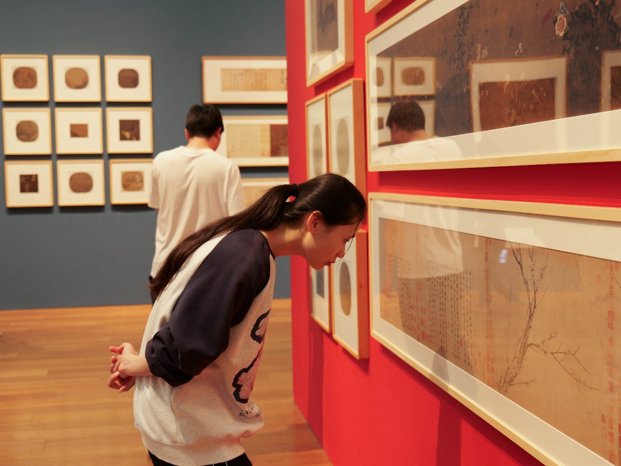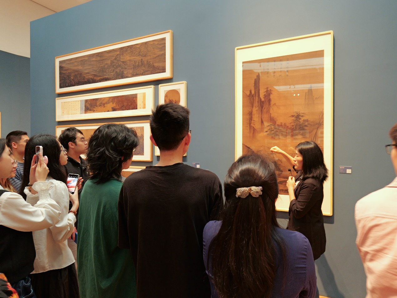 上午十点,学生们在老师的组织下有序进入浙江大学艺术博物馆。首先进行的是宋代艺术绘画展览的参观。宋代绘画以其高超的技艺和深厚的文化底蕴著称,是中国绘画史上的高峰期之一。讲解员从宋代绘画的起源开始,详细讲解了宋代绘画的主要特点、代表画家及其作品,比如“三流皇帝”“一流画家”的宋徽宗,讲解员为同学们详细介绍了宋徽宗笔下精妙恢弘的《瑞鹤图》、趣味盎然的《芙蓉锦鸡图》,同时提及了宋徽宗执政无力遂喜用画笔记录祥瑞之景的小小癖好,学生们认真聆听讲解,仔细观察每一幅画作,沉浸在宋代艺术的美妙世界中。