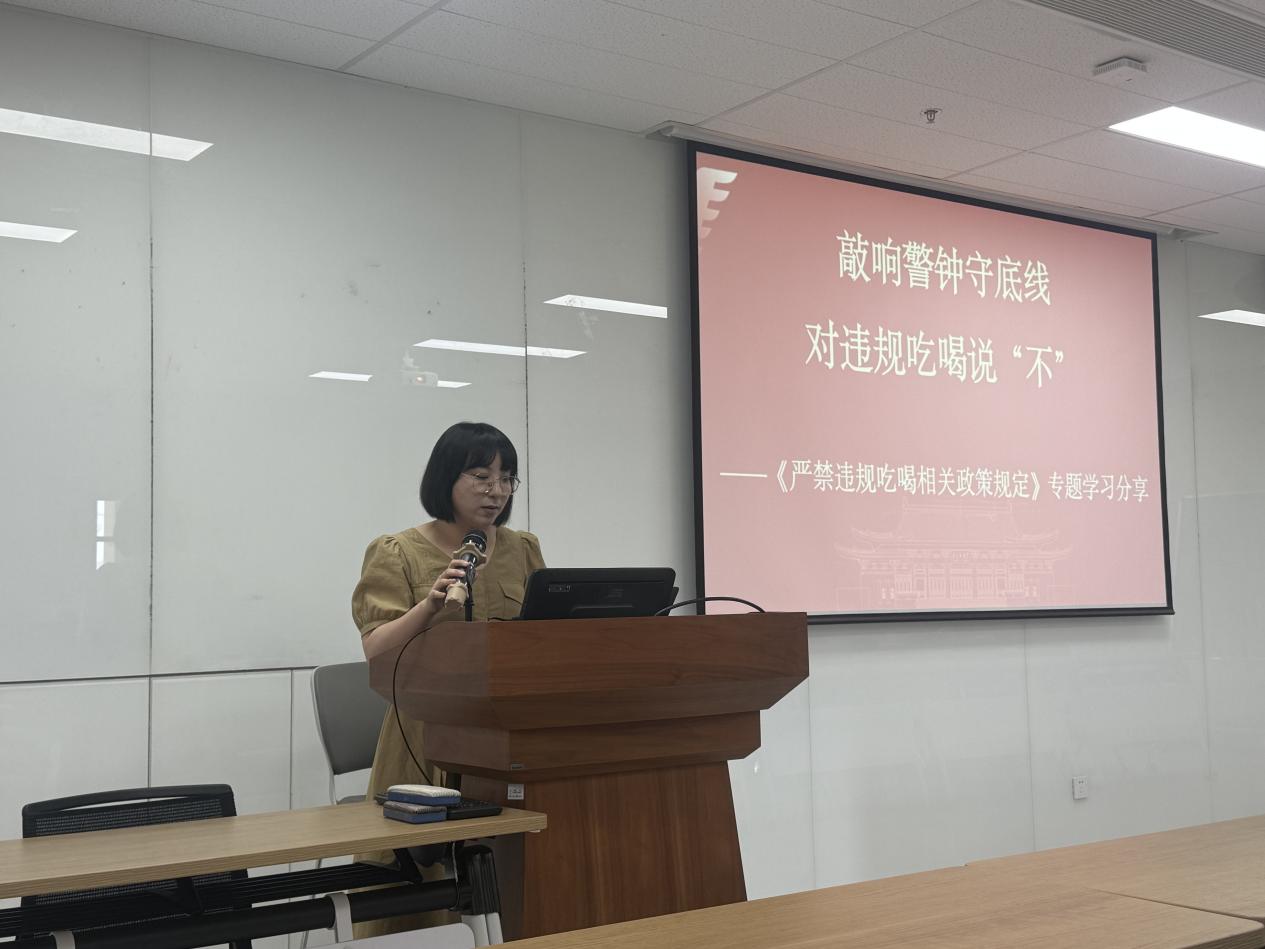 最后,徐冰娜老师就《严禁违规吃喝相关政策规定》带领大家进行专题学习。她从具体的政策规定、违规吃喝的主要表现形式、典型案例剖析和纠治违规吃喝的实践要求四个方面详细展开。她强调,作风建设永远在路上,广大党员干部要以案为鉴,重点关注负面清单,守住廉洁底线,做到不触电、不嘴软,不栽在因“饭”而设下的“局”里。