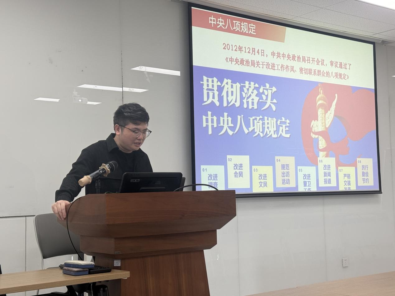 随后,俞鼎老师带领支部成员共同学习《党政机关厉行节约反对浪费条例》。他强调,本次理论学习是在全党开展深入贯彻中央八项规定精神学习教育的背景下展开的。他就中央八项规定的基本内容、遵循原则以及相关政策条例的发布时间和出台背景等内容进行了具体的展开介绍。