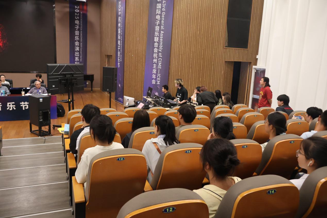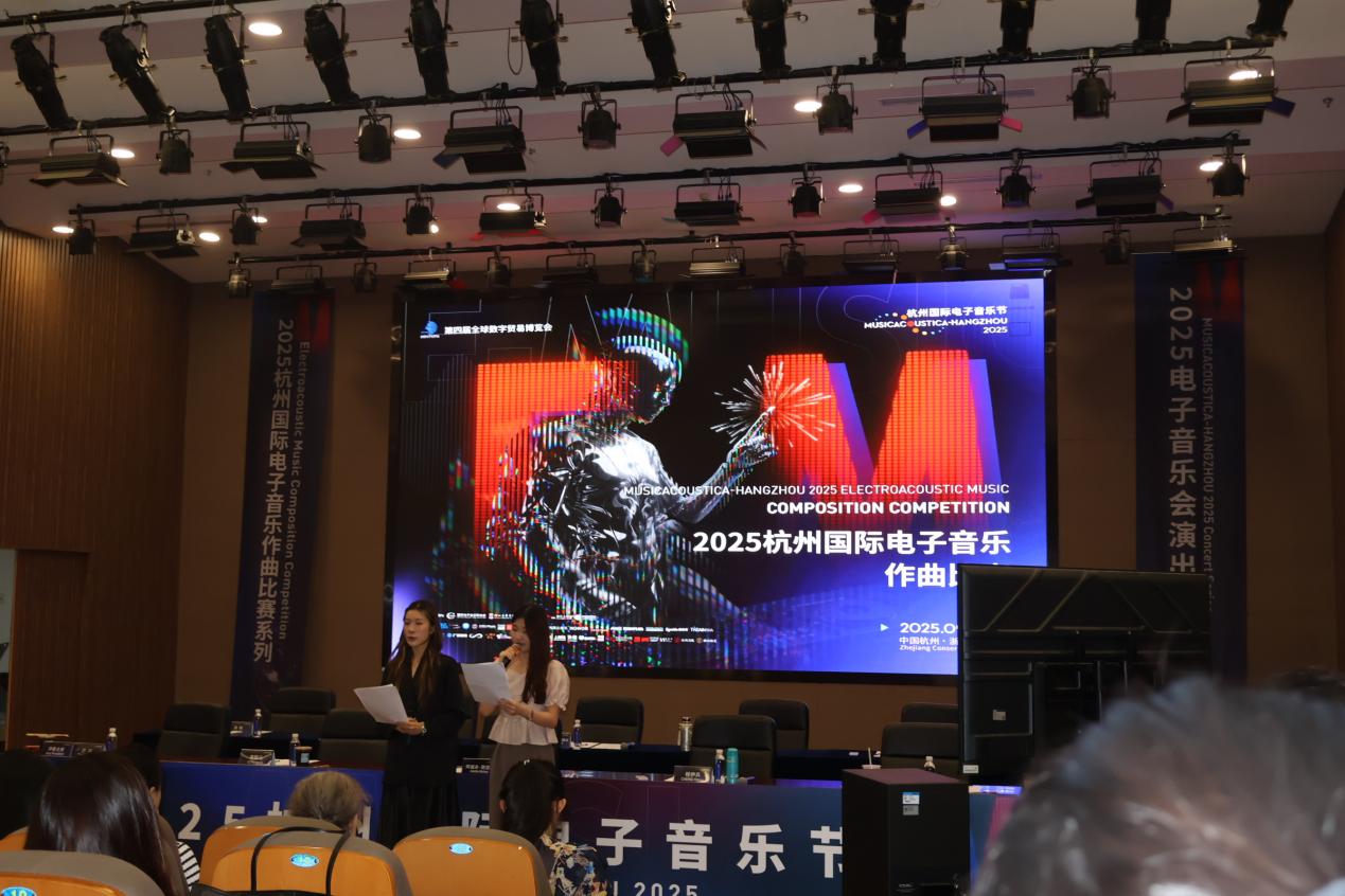 活动小组二观摩了2025杭州国际电子音乐作曲比赛C组:学术类/与视觉影像结合的多媒体电子音乐作品决赛。本赛事是杭州国际电子音乐节中最受瞩目的板块之一,要求参赛作品在声画深度交融中展现电子音乐的独特魅力。参赛作品中,有的以中华文化中的典型意象为主题展开音乐创编,在音视一体化的精彩表达中实现传统风韵与现代气息的共振;有的通过AI辅助创作,在电子律动与数字化图像的和谐交汇中实现了技术性与艺术性的统一;有的通过极具冲击性的视听表达抒发了深度的哲学思考,在对人类生存困境的严肃反思中提升了作品的艺术性。