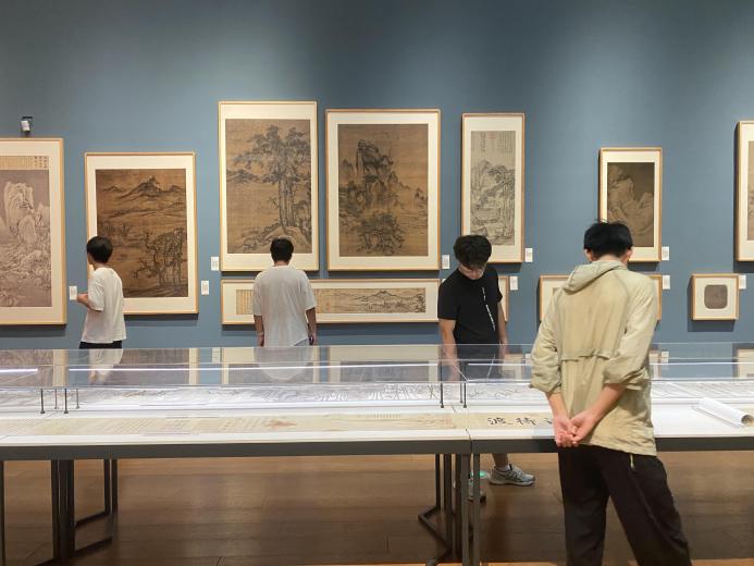 在艺博馆中,同学们先后参观了“中国历代绘画大系”特展、常设青铜器展厅及龙泉青瓷展等核心展区。面对跨越千年的艺术珍品,同学们结合课程所学,展开了热烈而深入的讨论。在观摩古代青铜礼器时,有同学指出,这些器物的形制、纹饰与铭文,不仅是精湛工艺的体现,更是当时社会等级制度、宗法观念和生产力水平的直接物证,是理解历史唯物主义中经济基础决定上层建筑的绝佳案例。在欣赏历代绘画作品时,大家则围绕艺术风格与时代背景的联系进行分析,探讨了社会存在如何决定社会意识,以及艺术创作自身的相对独立性和能动反作用。