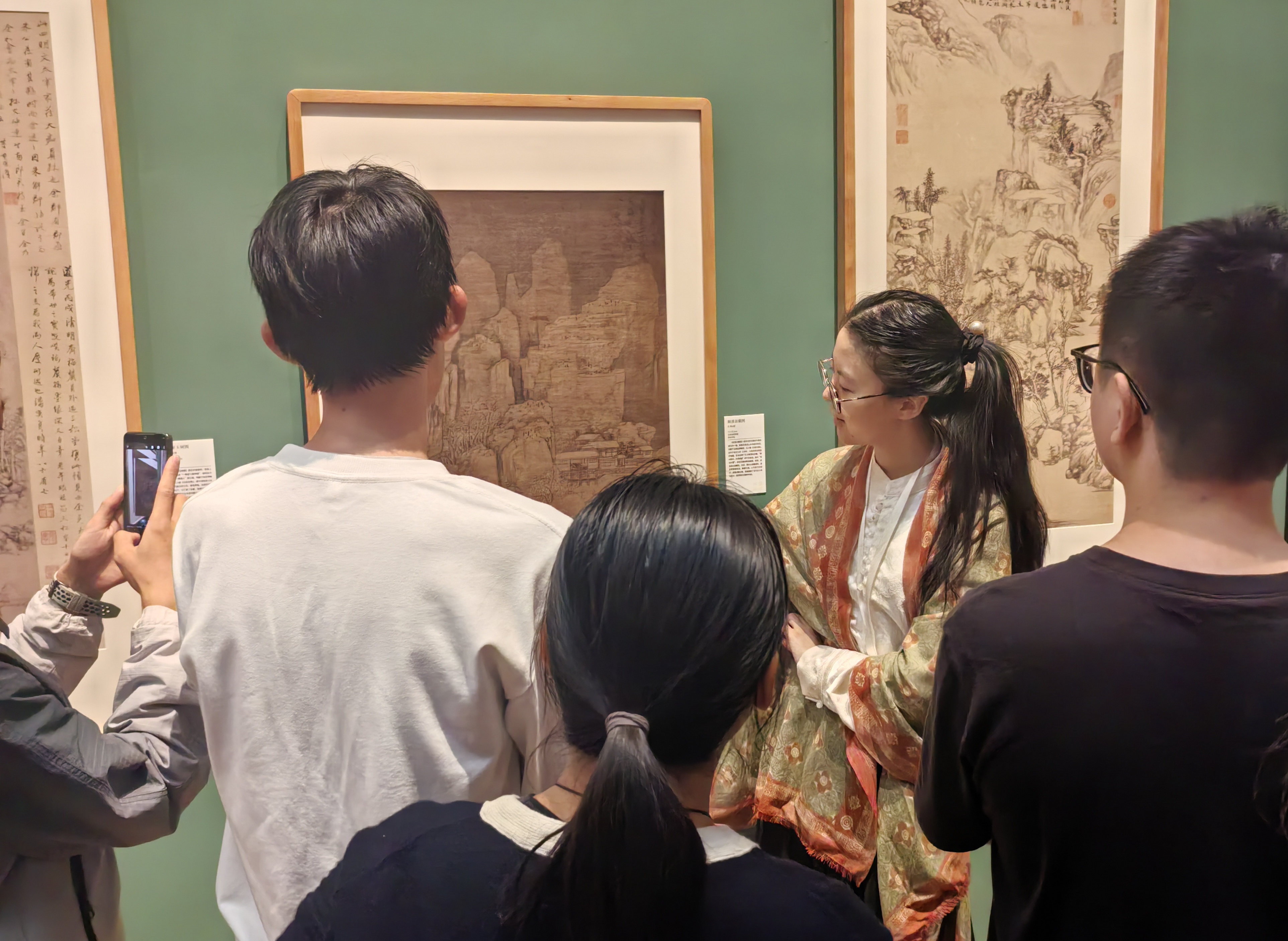 讲解员以温柔生动的诠释带领着同学们步入元画媒介背后那一意蕴深厚的时代。讲解围绕“元四家”的黄公望、王蒙、吴镇与倪瓒四名元画大家展开。黄公望《富春山居图》的长卷叙事、王蒙繁密的牛毛皴与厚重的全景式构图吴镇水墨表现的纯粹探索以及倪瓒的“一河两岸”式构图,四家笔墨语言呈现出元代文人如何将自然山水转化为安顿心灵的主体空间。