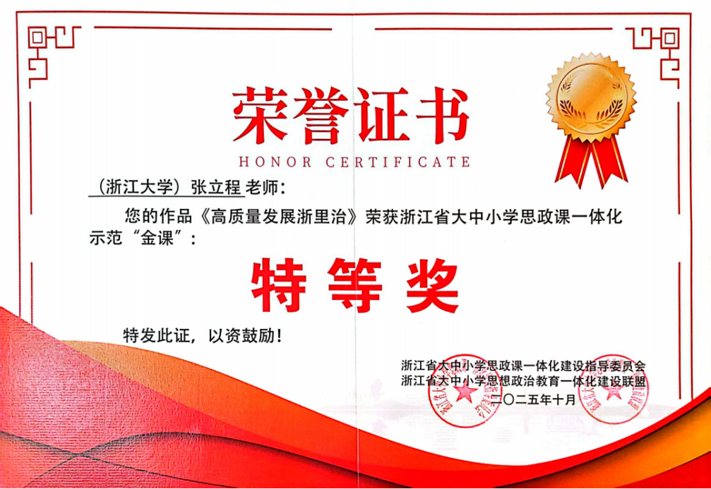 活动中,由浙江大学马克思主义学院张立程副教授携手余杭高级中学(临平中学)潘泉伟、临平第一中学张岚、临平区实验小学徐晓娜等老师共同打造的示范“金课”《高质量发展浙里治》,在众多作品中脱颖而出,荣获特等奖。