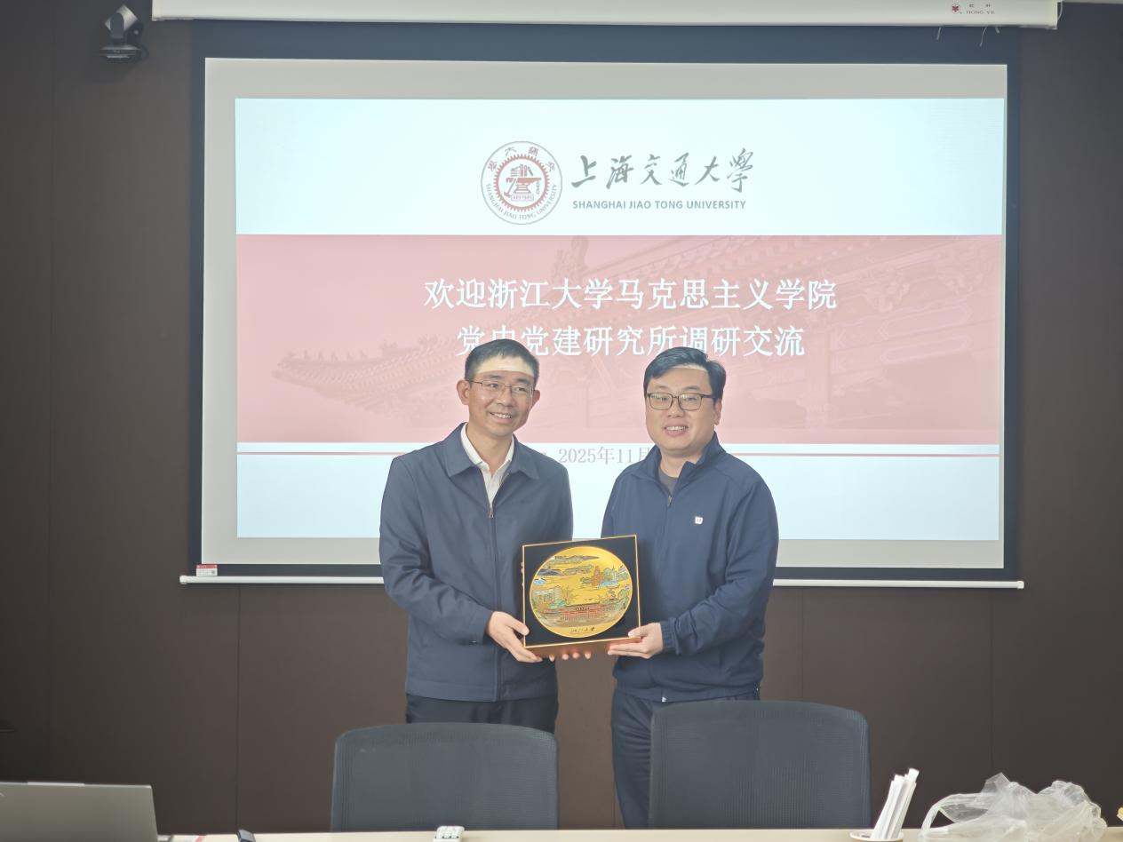上午,调研团队抵达上海交通大学马克思主义学院。上交马院副院长魏华,中国近现代史纲要教研室高福进教授、邓军主任,党建学科负责人刘欣然副教授,中国近现代史纲要教研室赖锐副教授及浙江大学优秀校友董方老师对浙大马院一行表示热烈欢迎。座谈中,魏华副院长与刘召峰副院长分别介绍了两院在组织架构、学生培养、教师队伍建设及教研室发展等方面的基本情况围绕教学实践中面临的共性问题深入交换看法。随后,双方聚焦《中国近现代史纲要》课程建设、教学方法创新等核心议题,由董海樱副所长与高福进教授、邓军主任等分别分享教学经验,一致达成加强两校马院常态化交流合作的共识,并就党史党建学科科研培育、教学团队梯度构建、青年教师成长及教学科研一体化发展等关键领域展开深度研讨。