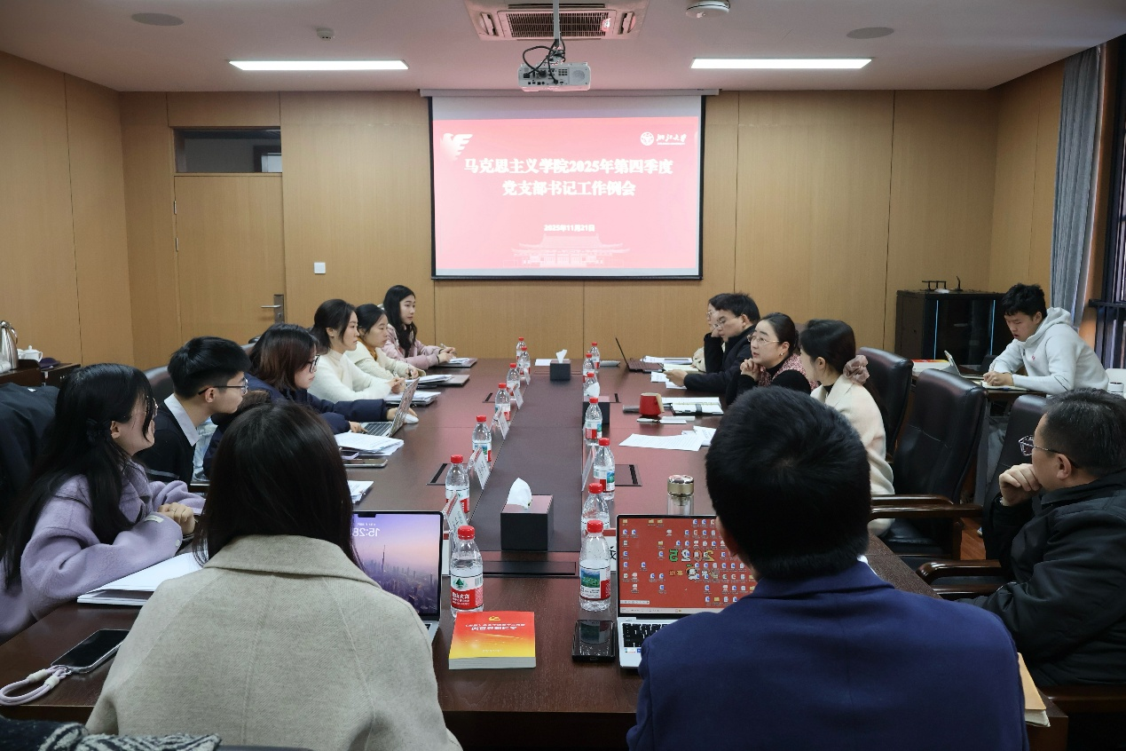 20251121日下午,马克思主义学院组织召开2025第四季度党支部书记工作例会专题学习党的二十届四中全会精神,部署基层党支部质量提升月工作。学院党委书记楼艳副书记骆笑及师生党支部书记参加会议。