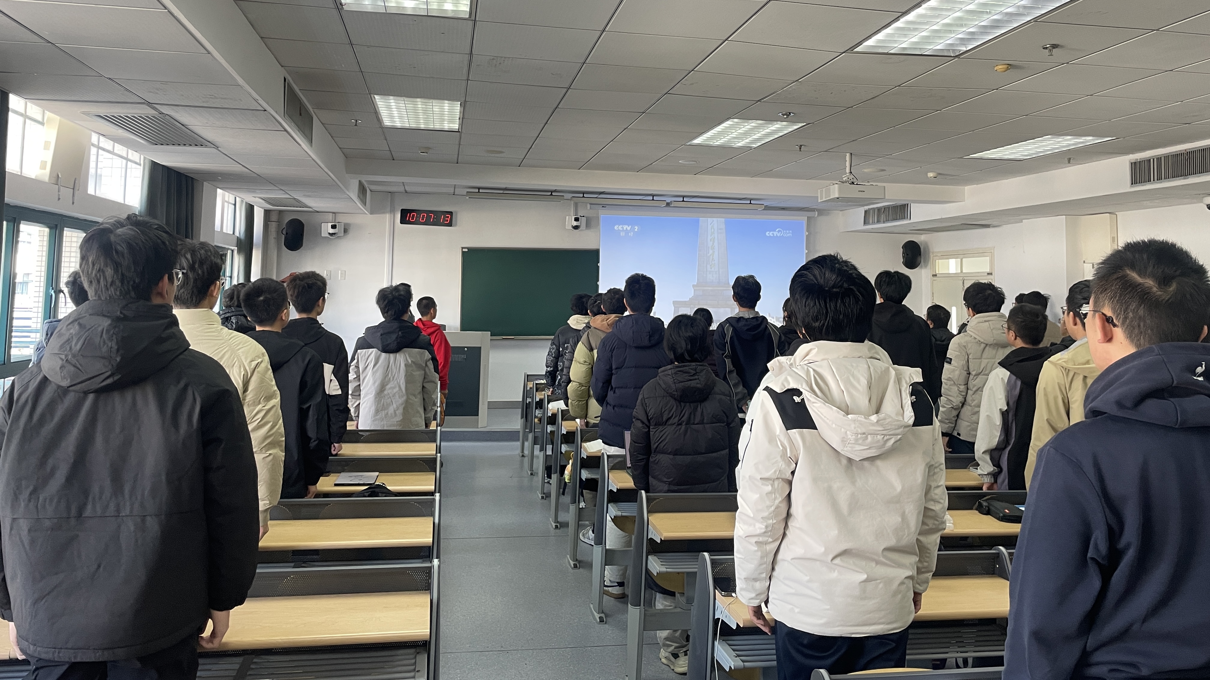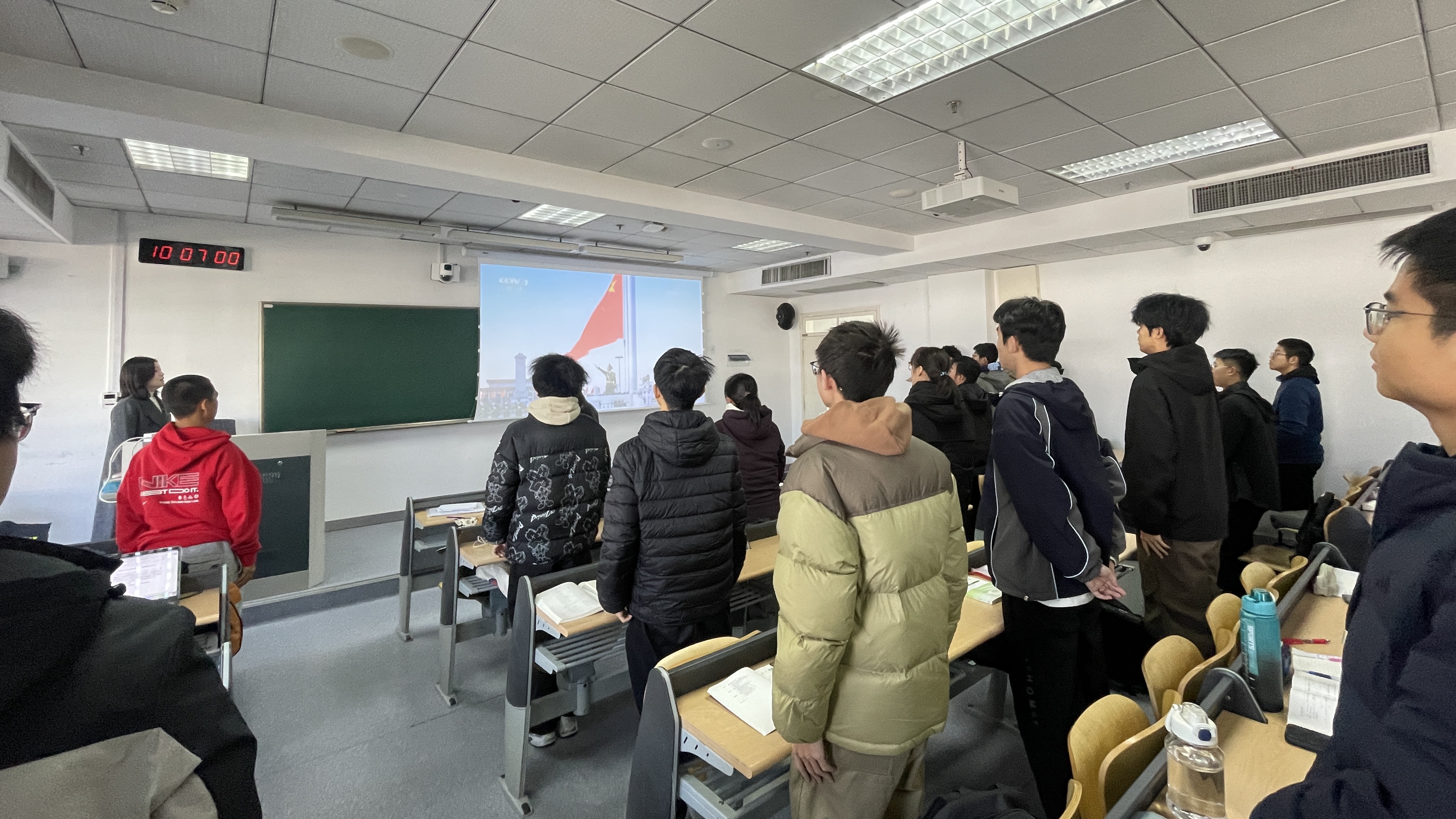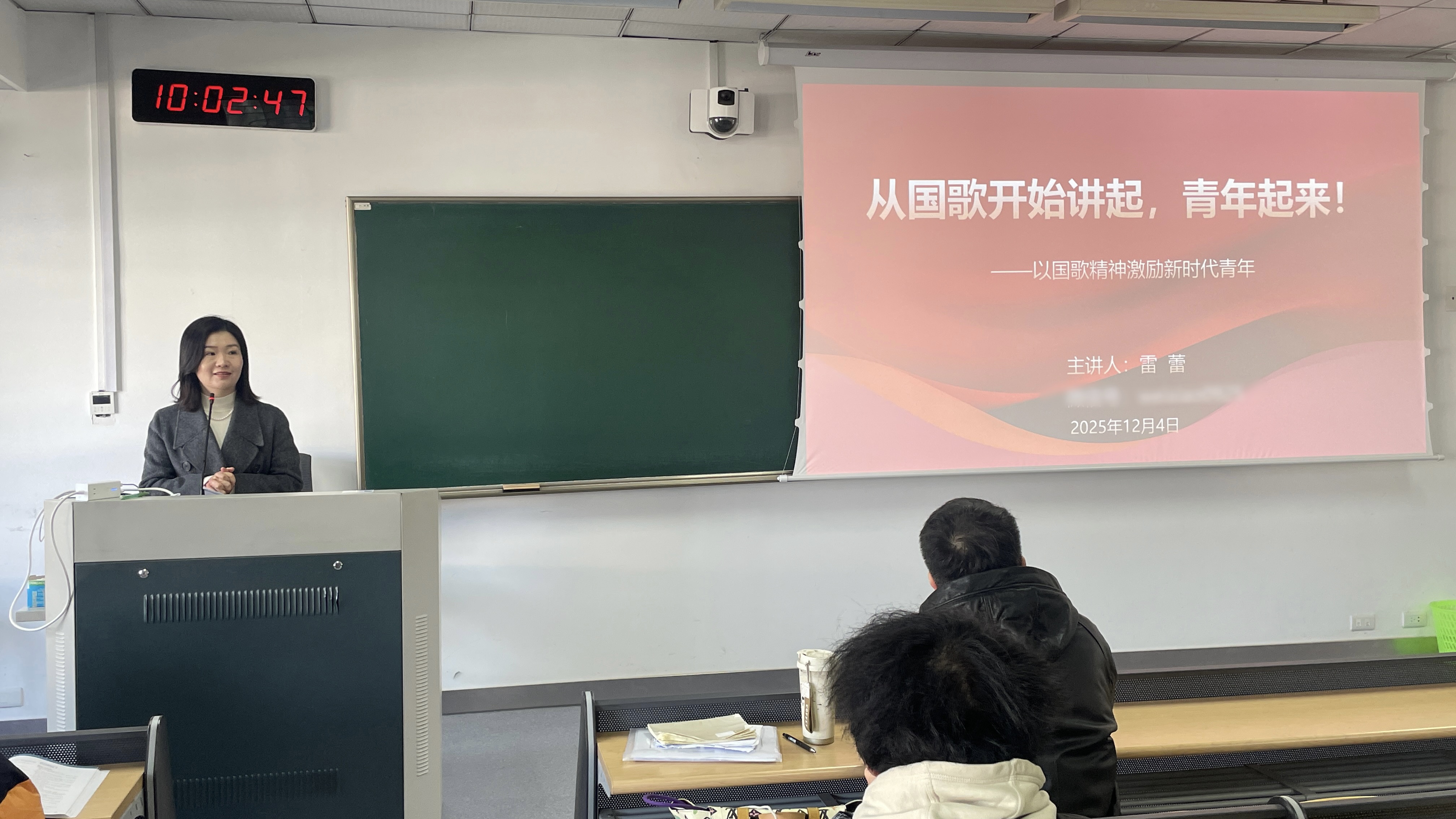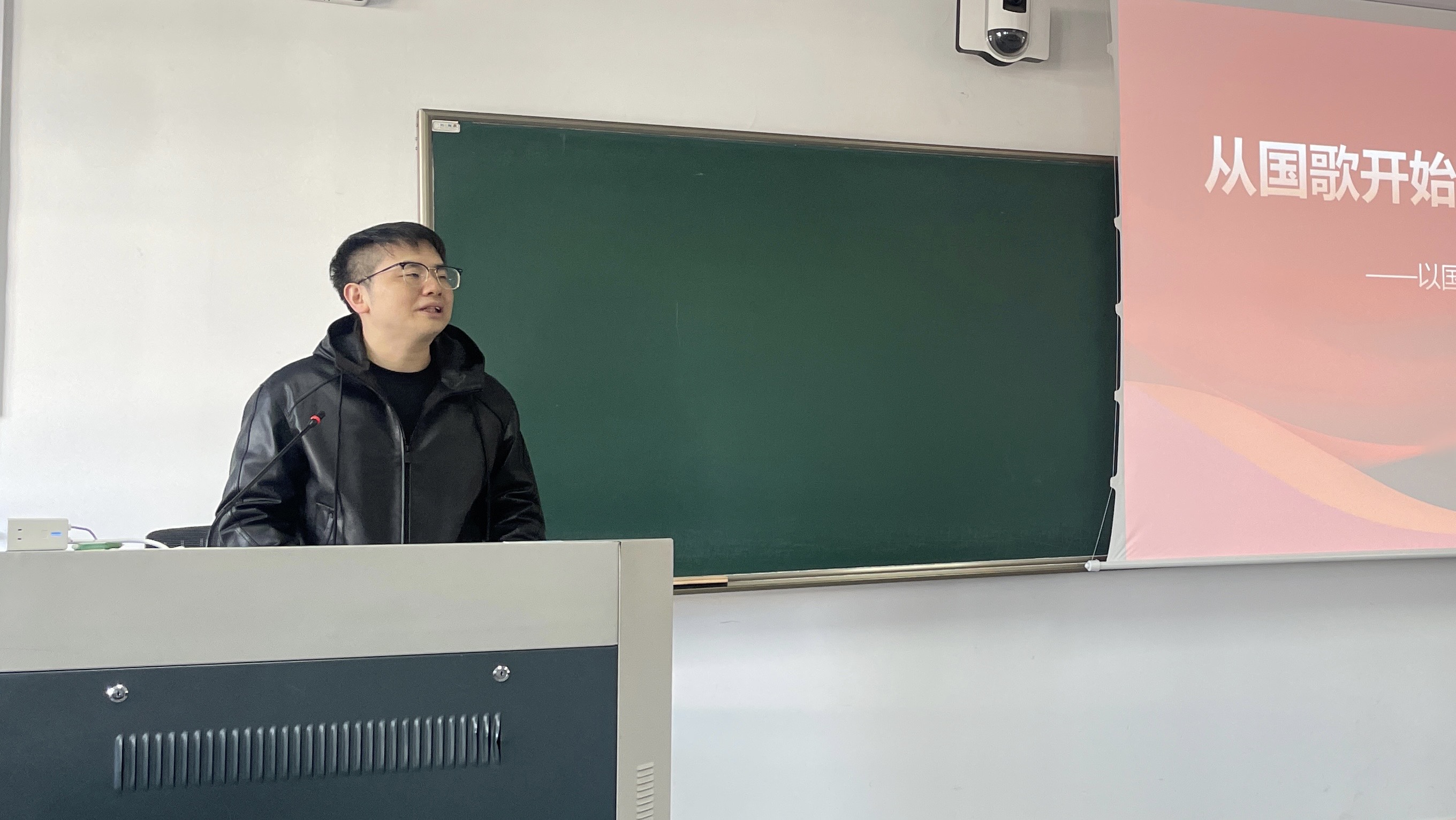 课程伊始,雷蕾书记带领全体同学肃立齐唱国歌,激昂雄壮的旋律瞬间凝聚起课堂的爱国氛围。她以“歌声里的中国”为切入点,通过一组生动鲜活的影像资料,呈现出不同场景下国人升国旗、唱国歌的庄严画面,娓娓道来歌声背后跨越时空的情感共鸣与精神联结,让同学们深刻体会到国歌作为国家象征所承载的民族记忆与奋进力量。
