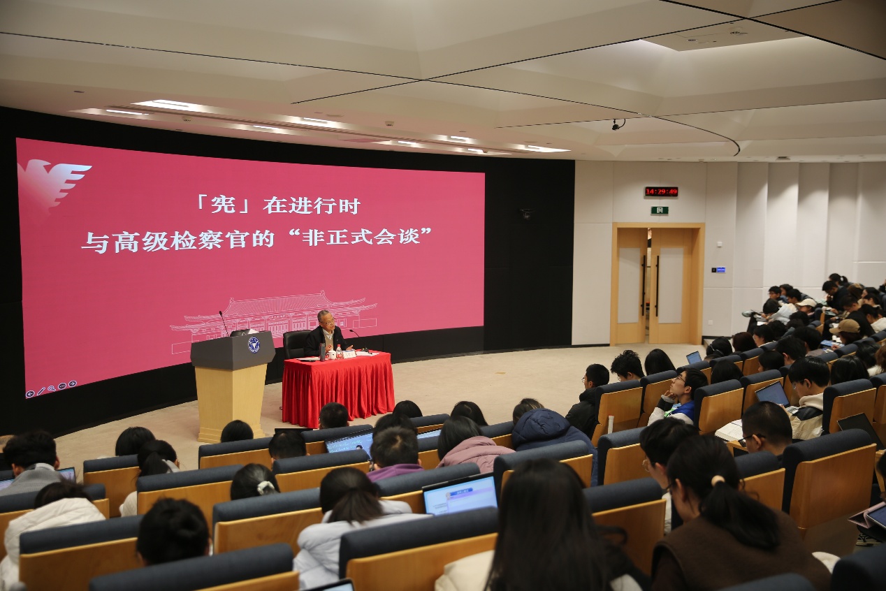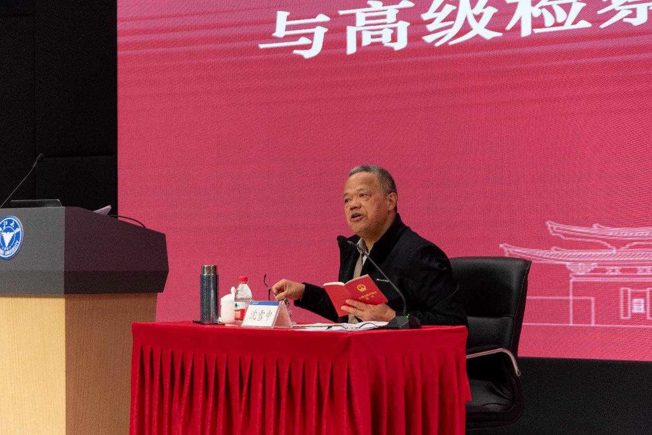 12月4日,正值全国第十二个国家宪法日,浙江省人民检察院原检察会专职委员、一级高级检察官、浙江省法学会未成年人刑事司法研究会会长沈雪中,从“法”字在古汉语中的由来讲起,就法律的特征、宪法的重要地位、检察院的基本职能及大学生群体中常见的犯罪案例等话题,与200余名“思想道德与法治”课程师生开展了一场“非正式会谈”。