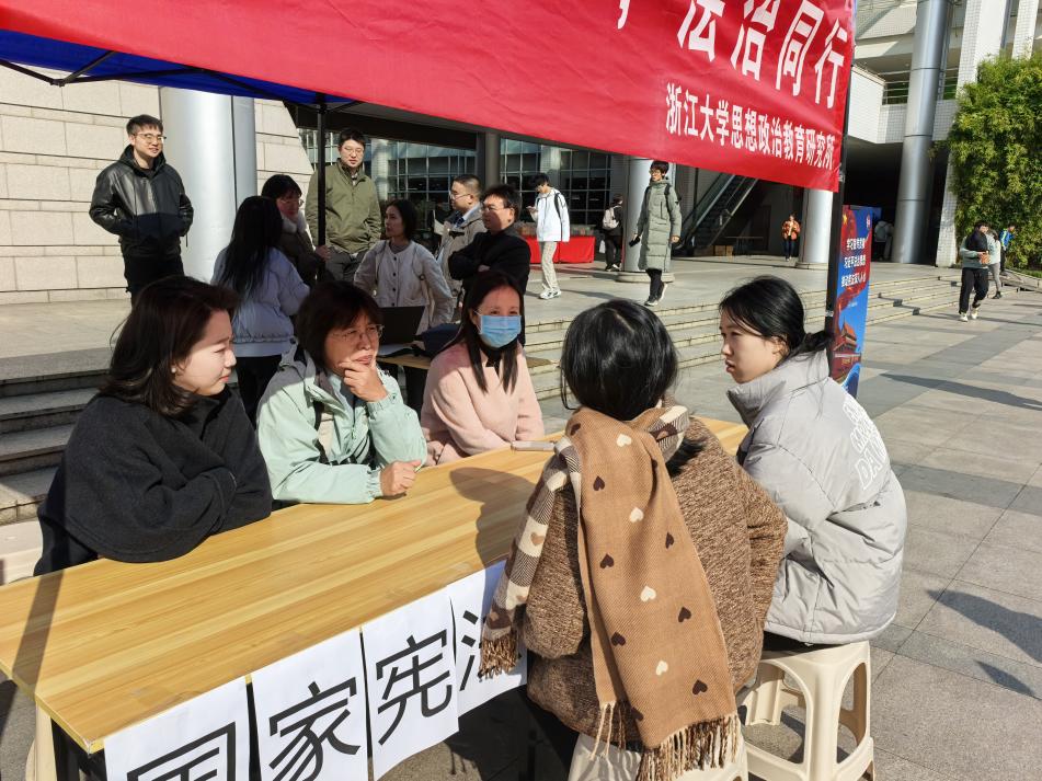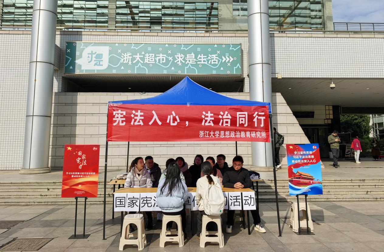 为深入学习贯彻习近平法治思想,推动宪法精神入脑入心,提升师生的法治素养,2025年12月,浙江大学马克思主义学院思想政治教育研究所组织开展“宪法宣传周”系列活动。从“法治专家进课堂”到“法治主题备课会”,从“志愿宣传咨询活动”到“主题海报亮相紫金港文化长廊”,活动以贴近青年视角的方式,将法治实践“活水”引入浙江大学校园,让抽象的法治精神转化为具象的实践体验。