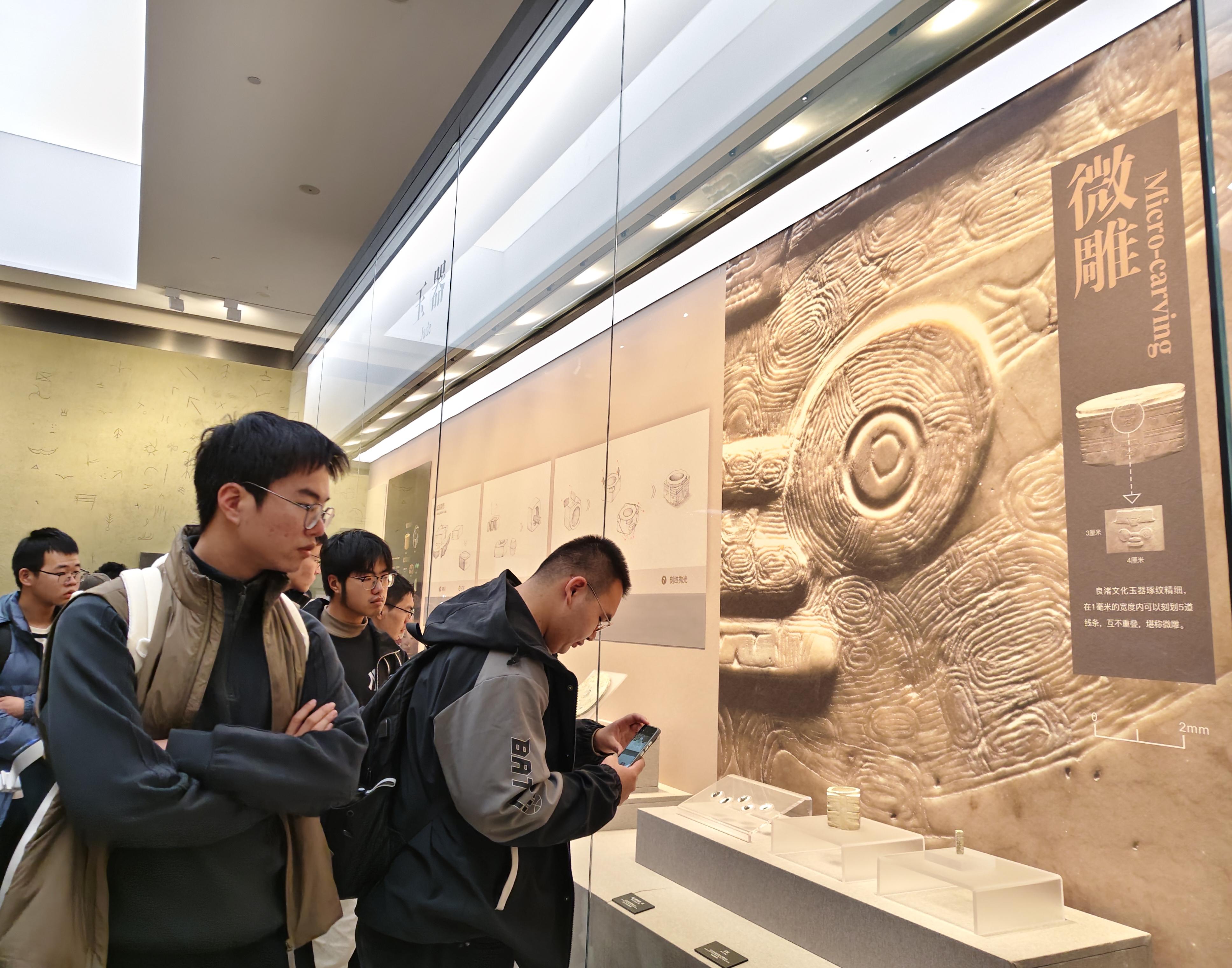 随后,师生进入以玉礼器为核心的展区,了解良渚社会的权力结构与精神信仰。一件件琮、璧、钺等玉器形制规整、纹样神秘、意蕴深厚,折射出先民当时统一的精神信仰以及明确的“王族”“贵族”“武士与工匠”“平民”四级社会分级与强大的早期国家组织能力。窗外光景美好,展厅内文明之光流转,同学们沉浸于古玉器雕琢之精与礼千年制文明萌芽之肃穆,深刻理解中华文明以礼成序的古老传统与和合共融的文化理念,由衷生出强烈的文化认同感。