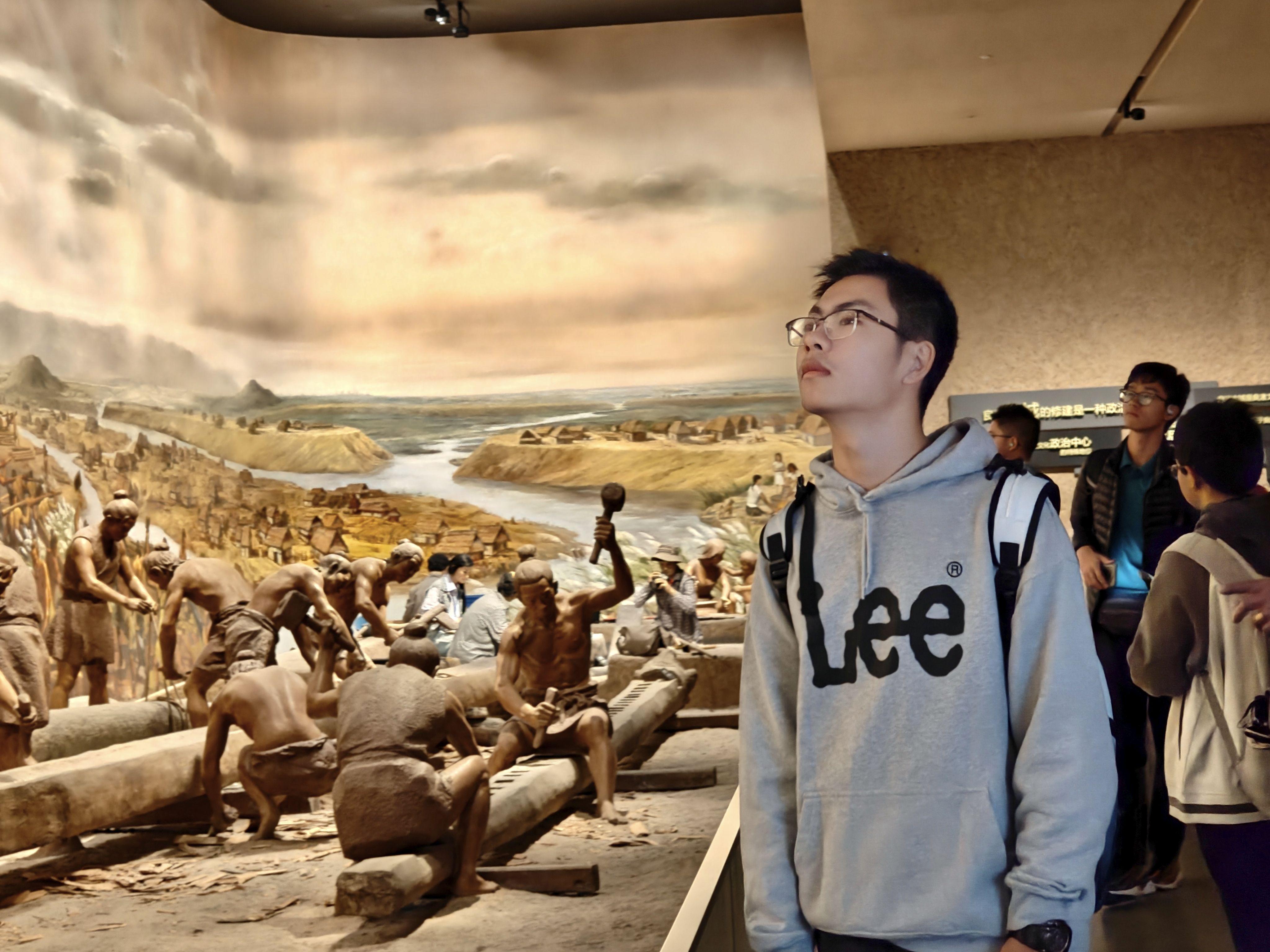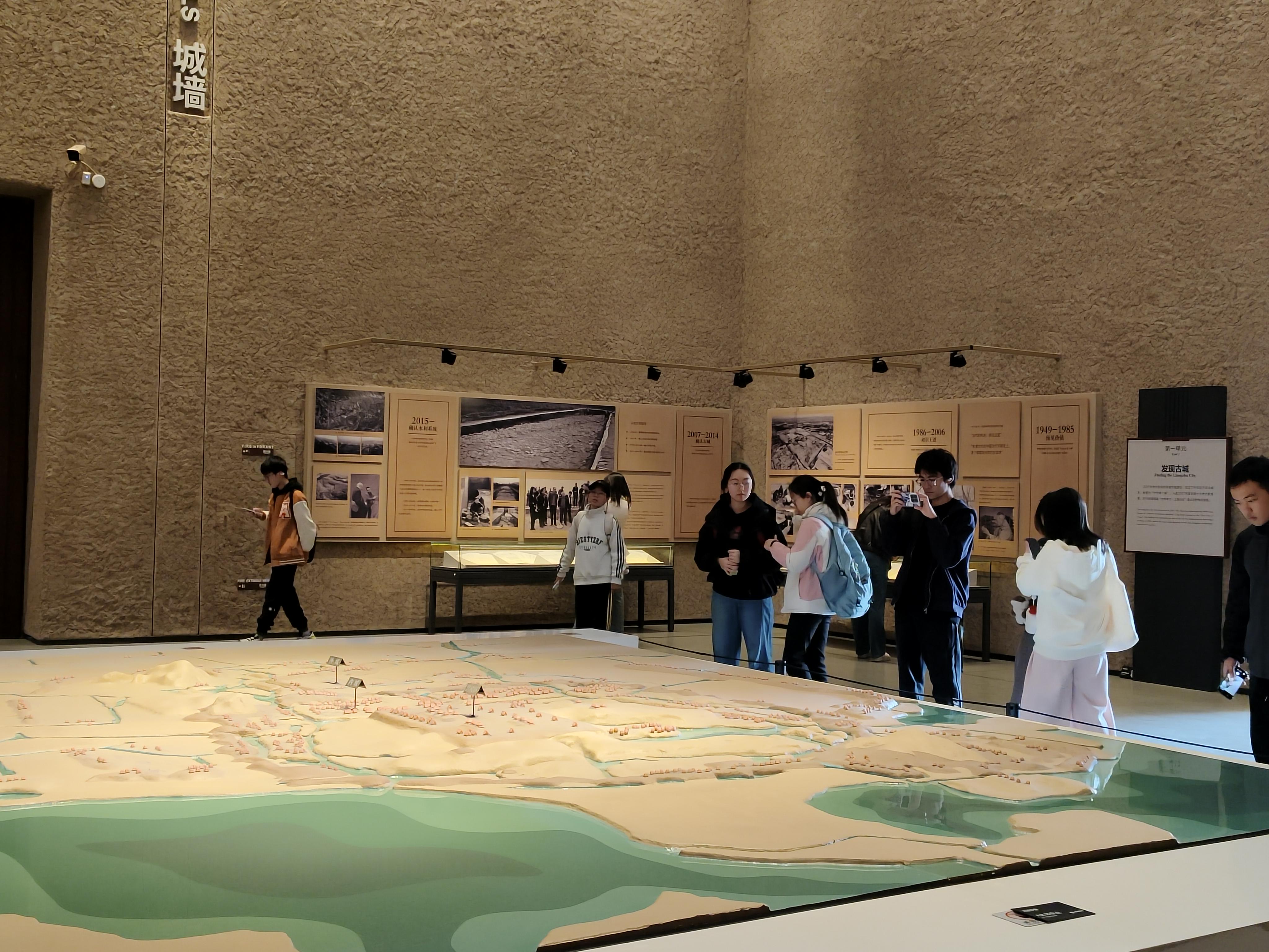 良渚博物院作为“中华文明探源工程”的关键遗址,静立于疏朗的秋末冬初风光里。同学们首先走进“水乡泽国”展厅。炭化稻谷、打磨石器、陶器器皿与先民生活遗存等实物,系统完整呈现出良渚文化时期发达的农耕体系与成熟的手工业分工。微缩模型与等比例复原模型将文字中古人生活劳作的场面化作一幅幅可知可感的立体图画,让同学们感知到几千年前的先民是如何生活、如何劳作创造出灿烂的良渚古文明的。展厅灯光投下柔和的光影,映照出良渚灿烂文化的景象,使同学们真切体会到良渚先民“开物成务”的创造智慧,也形成了对中华文明早期灿烂成果更生动的认知。
