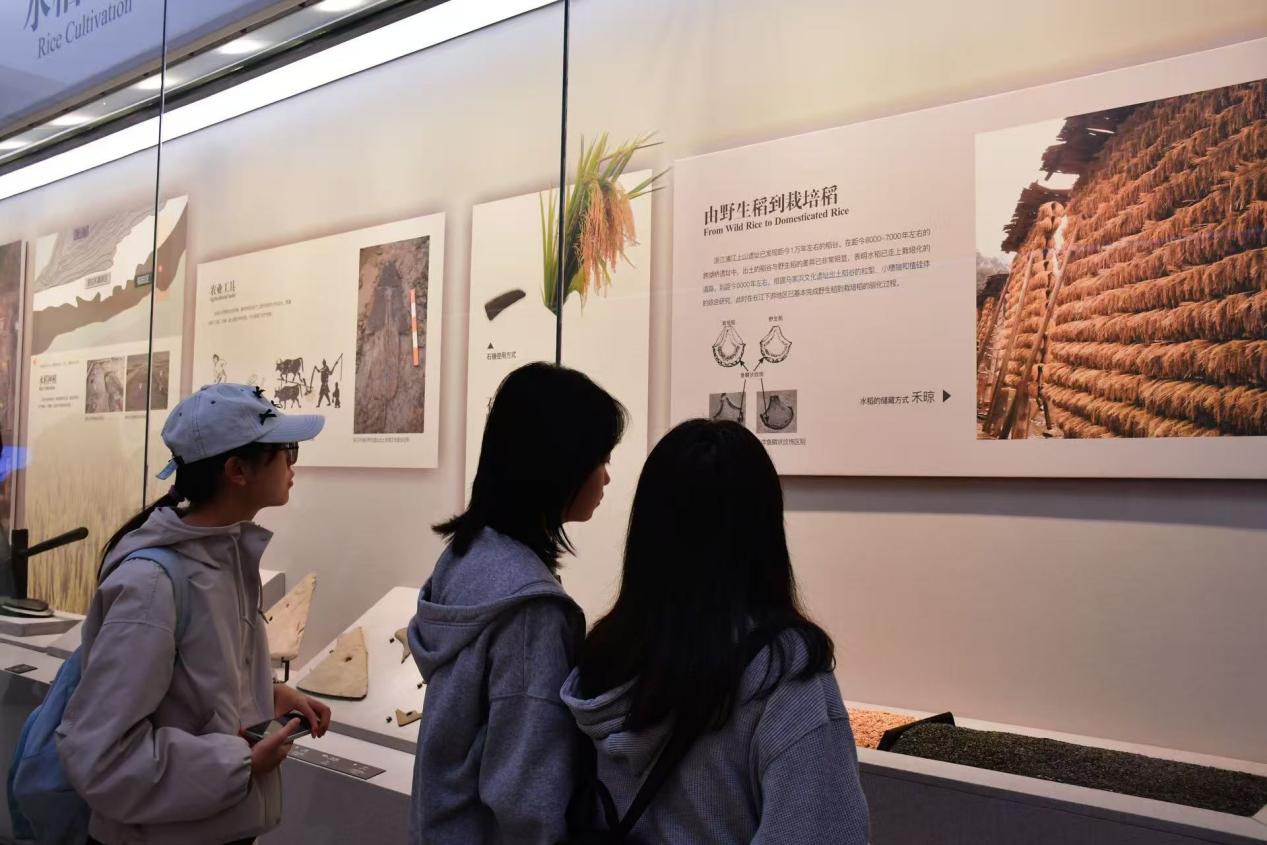 师生们首先参观了水乡泽国主题展厅。这个展厅的名字呼应着良渚先民与环太湖流域水土共生的文明起源,系统呈现了距今五千年良渚文化的孕育根基。同学们不仅了解到这片温暖湿润、水网密布的土地如何成为文明摇篮,还直观看到了稻作农业、竹木器手工业等支撑文明发展的经济基石。现场教学就这样将课本里的“良渚文明”从概念变成了可触摸的生产场景与生存智慧,让大家真切感受到早期文明生长的温度。