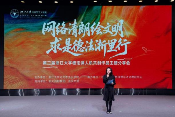 在“将人工智能技术融入教育教学全要素全过程”的战略指引下,浙江大学马克思主义学院积极探索人工智能赋能教育教学模式创新,推动思想道德与法治课程(以下简称“德法课”)向智而行、以智启新、用智向善。12月16日下午,由浙江大学马克思主义学院主办,思想道德与法治教研中心承办、浙大后勤集团与浙大文创联合支持的第二届浙江大学德法课人机共创作品主题分享会在浙江大学紫金港校区举行。本次分享会以“网络清朗绘文明,求是德法浙里行”为主题,创新打造舞台上的“德法课”,在生动活泼又意蕴深刻的人机共创作品展演中,同学们沉浸式体验,共同探寻科技、道德与个人成长交织共生的蓬勃活力与无限可能。活动现场还同步展出了同学们的人机共创作品,吸引了广大师生驻足观赏。