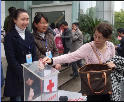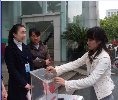 4月19日中午,天空下着濛濛细雨,但雨水浇不灭的是同学们对灾区同胞赤诚的热心。中午10点45分,思政部的团员们作为志愿者来到校医院为募捐活动做准备工作,搬桌子、拿募捐箱……11点整,募捐活动在西溪食堂门口准时开始,思政部的团员们向过往的人们发放为玉树同胞捐款的倡议书,募捐箱前,不时地有热心人驻足捐款:有朝气蓬勃的年轻人,也有白发苍苍的老人;有西溪校区的在校师生,也有过往的好心人。尽管年龄不同,身份各异,但都同样有着对灾区人民的关爱之心。10元、20元、50元、100元……一片片爱心像潮水一样涌入捐款箱,每次接到捐款,志愿者都会代表灾区人民诚挚地说一声谢谢!