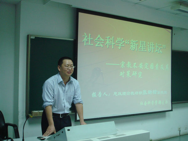6月9日晚上,我校社会科学学部主办的“社会科学‘新星讲坛’”在紫金港校区东1-206室顺利举行。本次讲坛教师为思政部张新樟副教授,思政部部分教师、研究生及来自全校的部分师生听取了张新樟老师题为“宗教不安定因素及其对策研究”的专题讲座,张老师还回答了近10位同学提出的相关问题,讲座受到了广大听众的好评。思政部副主任马建青教授主持了本次讲座。