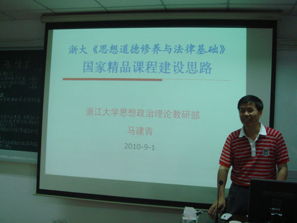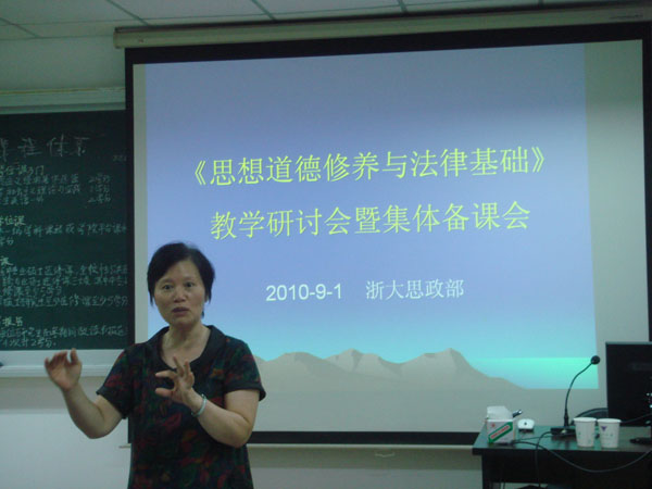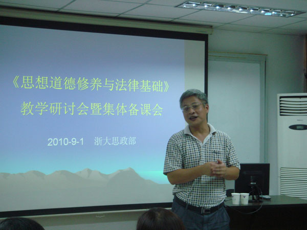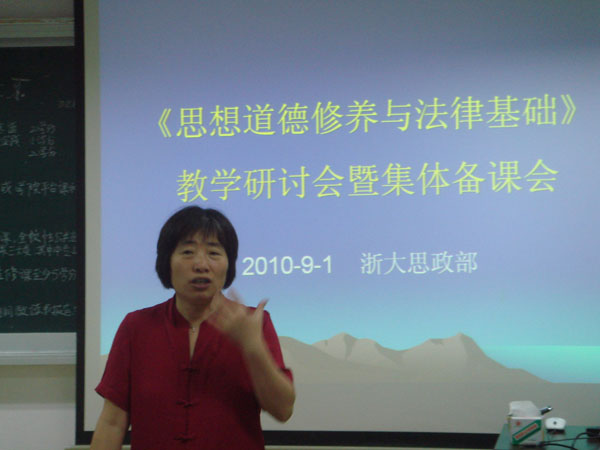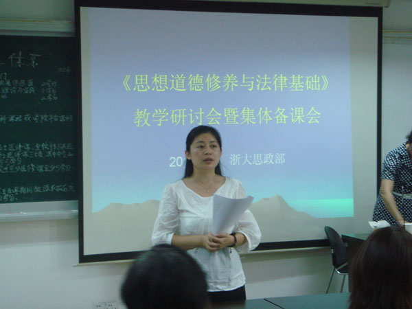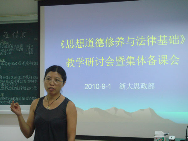 会议的主体内容分为两部分,在前半部分中王东莉教授介绍了《思想道德修养与法律基础》课秋冬学期的教学安排及要求;思政部副主任马建青教授介绍了国家精品课程《思想道德修养与法律基础》的申报过程及建设设想。在后半部分的教学研讨中,兼职教师代表陈炯老师和吴卫华老师分别介绍了教学经验和体会,马建青老师、万慧进老师、梁清华老师、陈小英老师和王东莉老师分别就教学中的某个问题的研究做了发言。