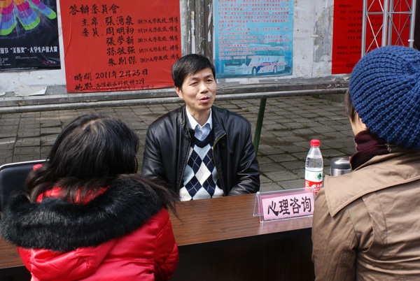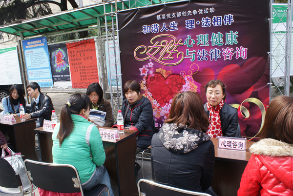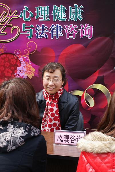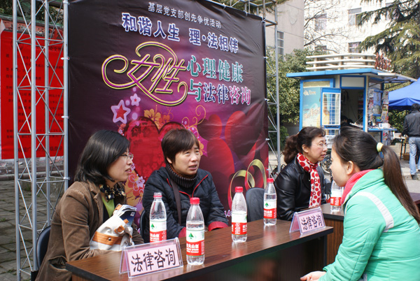 2011年3月8日,春光明媚。上午11时,思政教研部思想道德修养与法律基础教研室党支部“创先争优”系列活动在西溪校区北门食堂门口拉开了序幕。本期活动主题为“和谐人生 理•法相伴——女性心理健康与法律咨询”, 旨在为师生解决心理困惑,提供法律帮助。党支部知名心理咨询专家马建青教授领衔的心理咨询团队与有着25年律师执业经验的陈小英副教授领衔的法律咨询团队共计7人参与了这次活动。