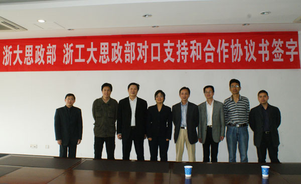 2011年5月5日,我部与浙工大思政教研部签署对口支持和合作协议签字仪式在浙工大屏峰校区举行。我部主任吕有志,直属党总支书记张永华;浙工大思政部邢乐勤主任、思想政治教育学科带头人方巍等参加了签字仪式。
