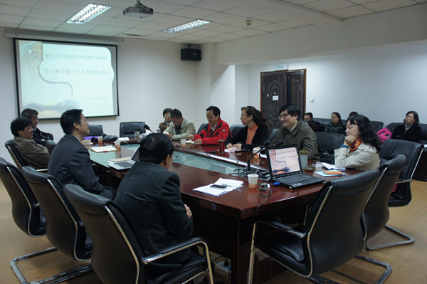 11月16日上午,思政教研部在西溪校区教学主楼1125会议室召开“学习和贯彻十八大精神”座谈会。思政教研部党总支委员、各教研中心正副主任、教工学生党支部书记、全体行政人员参加了此次座谈会。党总支书记张永华主持会议。