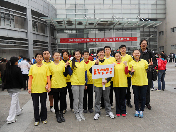3月29日下午,全校期盼的浙江大学“舒鸿杯”环紫金港师生接力赛在紫金港校区拉开帷幕。思政教研部工会积极组织10人参赛队伍,在马建青副主任的带领下,金建伟、梁清华、代玉启、喻嘉乐、周艳5人教工和陈大鹏、张曼华、李晶晶、陈一良4名学生穿上统一服装参加比赛 。