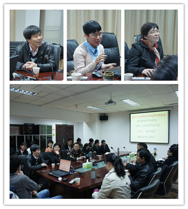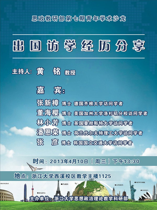 以“出国访学经历分享”为主题的思想政治理论教学科研部第七期学术沙龙于2013年4月10日下午在浙大西溪校区教学主楼1125会议室成功举办。本次活动在黄铭教授的主持下,特邀了曾访学荷兰、德国、美国、英国和韩国的五位青年老师做嘉宾,他们分别就自己的访学经历作了精彩的报告,参与活动的师生有30多位。