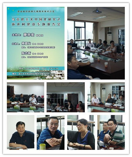 思想政治理论教学科研部第九期学术沙龙于2013年6月14日下午在浙江大学西溪校区教学主楼1125会议室成功举办。本期学术沙龙的主题为“马克思主义中国化研究之新农村建设专题报告”,由傅夏仙老师与陈志新老师为与会的十余位师生作相关学术报告,活动由廖亦宏副教授主持。