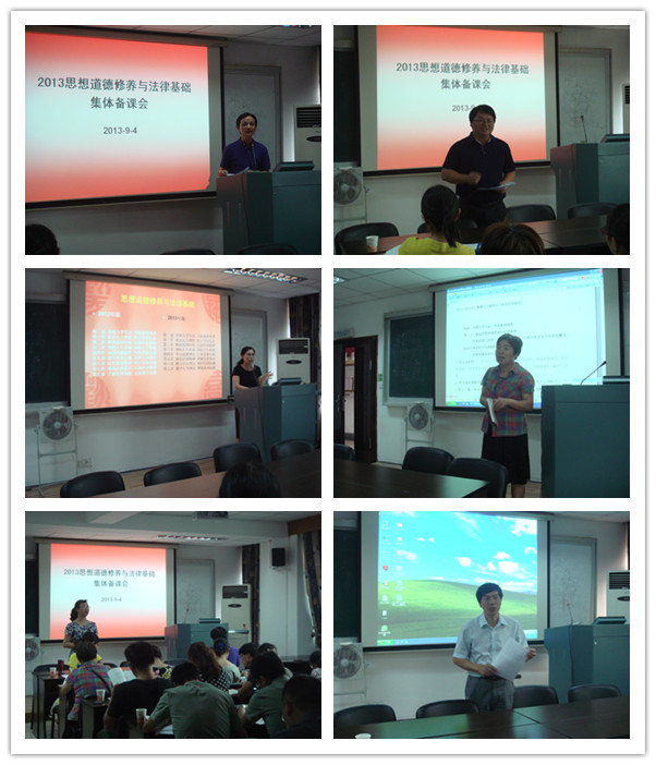 今年是18大以后本课程新教材的第一次使用,教材跟以往相比做了重大修订。本次备课会针对修订后的新教材做了相应的准备,会议内容主要围绕着新教材的精神展开。8月底教研中心副主任封丽萍老师去北京参加了教育部举办的2013年思政理论课的教学会议,她首先在集体备课会上传达了北京会议精神,并介绍了教材的修订原则以及具体的修订细节;陈小英老师具体讲解了新教材法律部分的讲授要点和思路;教研中心主任王东莉老师就新教材的内容介绍了《思想道德修养与法律基础》课秋冬学期的教学安排及要求,特别是对新教师如何上好这门课提出了需要注意的若干问题。最后,思政部副主任马建青教授对本次备课会做了很好的总结,特别是对今年即将实施的课程考核方式改革的内容做了讲解,强调了考核方式改革的重要意义。
