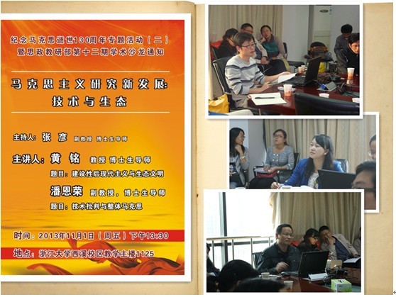 11月1日下午,浙江大学西溪校区教学主楼1125会议室座无虚席,浙江大学思政教研部“纪念马克思逝世130周年专题活动(二)暨思政教研部第十二期学术沙龙”如期举行。本期沙龙主题为“马克思主义研究新发展:技术与生态”,有近四十位教师和研究生参加了活动,黄铭教授和潘恩荣副教授分别就马克思主义生态和技术做了主题报告,张彦副教授担任本次沙龙主持人。
