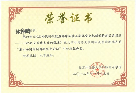 2013年11月15日至16日,思政部国际政治专业级硕士研究生张伟鹏同学应邀赴北京外国语大学参加由其举办的第六届国际问题研究生论坛。本次论坛以“大国崛起与国际体系变迁:历史、理论与前景”为主题,共收到来自清华大学、北京大学、浙江大学、中国人民大学、中央党校、武汉大学、吉林大学、北京外国语大学以及上海外国语大学等国内知名高校的68位硕士生同学的投稿,最终选出15位同学的论文成为优秀论文,并邀请获奖论文的作者赴京出席论坛做主题发言。我部张伟鹏同学的论文《后冷战时代欧盟地缘环境与集体安全机制的构建关系探析——一种安全区域主义的视角》结构清晰,观点新颖,被论坛组委会选中,并获得了论坛评委们的高度评价。张伟鹏同学的这篇论文已被收入《第六届问题研究生论坛优秀论文集》,为思政部争得了荣誉。