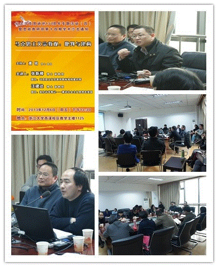 12月6日下午,西溪校区教学主楼1125会议室座无虚席,浙江大学思政部学术沙龙第十四期“马克思主义宗教观:批判与建构”正在举行,这也是纪念马克思逝世130周年专题活动系列之一,本次学术沙龙由思政部“宗教与和谐社会建设研究所”承办。思政部张新樟副教授和汪建达副教授分别做了主题报告,黄铭教授主持了本次沙龙。首先张新樟副教授做了题为“马克思主义宗教判教标准构建初探”的主题报告,张老师讲述了为何宗教会产生判教标准,通过对马克思主义的宗教观与其它宗教观的对比中得出我们不能只用“有神”与“无神”来作为宗教判断的标准,即宗教判断标准需要创新。张老师提出了除此之外的两大判准,其一为构建一个体系,在体系中寻找生命意义,这一体系类似于符号系统,人们深入其中便会忘却原先的生存焦虑。其二为马克思主义的“实事求是”辩证法。其间,张老师用生动的案例和体验为我们讲述什么是“实事求是”,怎样的生命状态才是符合“实事求是”的本质意蕴,最后得出宗教的本质便是精神层面的宁静与祥和,克服恐惧并适时处理危机。接下来是汪建达副教授为我们做题为“英伦访学散记—兼论社会主义思想在英国”的主题报告,汪老师的讲述略显轻松活泼,他讲述了英国维多利亚时期的社会主义思想,并为我们展示了他在英国伯明翰大学访学期间的一些照片,如牛津大学、剑桥大学、英国工人博物馆、马克思墓地等。活动第二部分,在座的各位老师和学生就报告提出自己的看法。整个讨论过程大家都积极参与,非常热烈。最后,黄铭老师总结本次沙龙活动,希望思政部学术沙龙越办越好。 (顾青青 洑景亭 供稿)