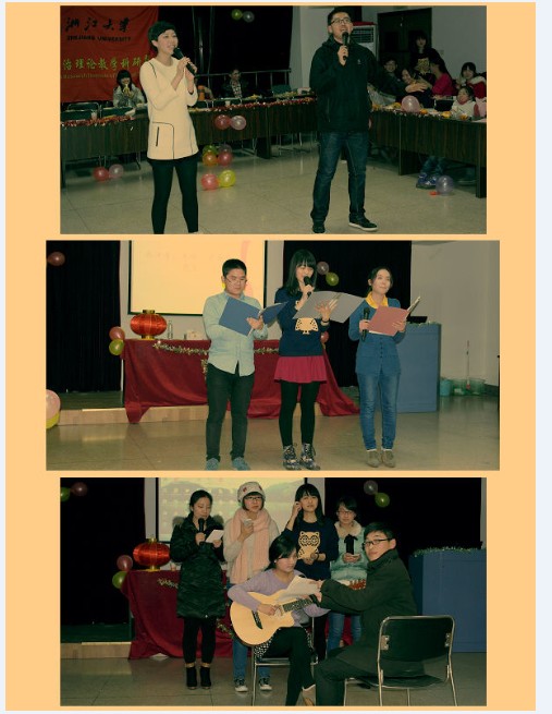 晚会由思政教研部硕士研究生和博士研究生自编自导的14个节目组成,包括舞蹈、歌曲、乐器弹奏、相声、魔术、朗诵、情景小品等多个类别的活动,其中歌曲类包括独唱、二重唱、外文歌曲串烧等多形式的展现方式,晚会节目内容丰富,精彩纷呈。晚会开始前,硕士一年级的同学们通过四段幽默搞笑同时又十分感人的视频向思政教研部全体老师及同学送上了新年祝福,同时也通过视频展现了各个宿舍同学们相识半年以来生活的点点滴滴,浓浓的姐妹情、兄弟情展现在其中。本次晚会由洑景亭同学和杨光同学担任主持,赵云旎同学领衔的现代舞为晚会正式拉开了序幕。赵恩国博士以一曲《梅花三弄》古琴弹奏为晚会带来了一股深厚的人文气息,而石然博士的一首《死了都要爱》则将晚会带入了第一个高潮,之后汪义勇和刘佳两位同学的相声在吸收了原有节目的精华基础上,又加上了个人搞笑语录和当下同学们关注的事件,笑点不断,可谓相当精彩!第一部分最后由王瑞同学主持的游戏环节也使大家笑得合不拢嘴,场上场下互动热烈。